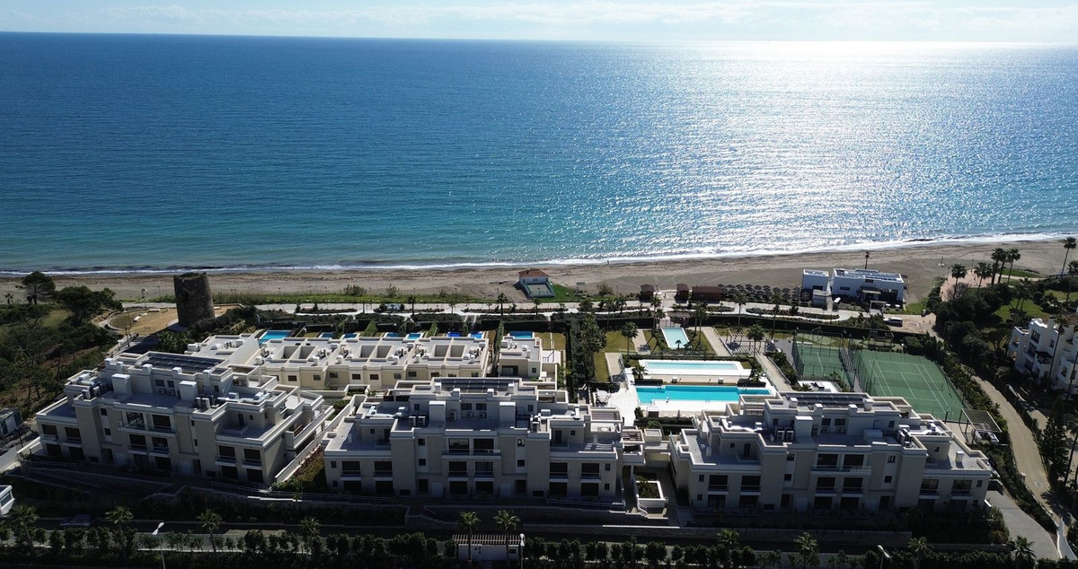 The gated community is just as impressive as the house. It is recognised as one of the most exclusive coastal developments on the Costa del Sol. Spanning approximately 15,000m² this seafront development offers its residents a luxurious beach lifestyle. It boasts a heated outdoor infinity swimming pool, day beds, a children's swimming pool and playground, concierge services, tennis court, padel court, gym, Jacuzzi, outdoor kitchen and BBQ pavilion, and, of course, direct access to the beach and the beautiful promenade. The urbanisation is known for its quality and beautiful style of architecture using natural stone to enhance the serene beach feel and was constructed with a commitment to the environment, promoting a more sustainable construction.