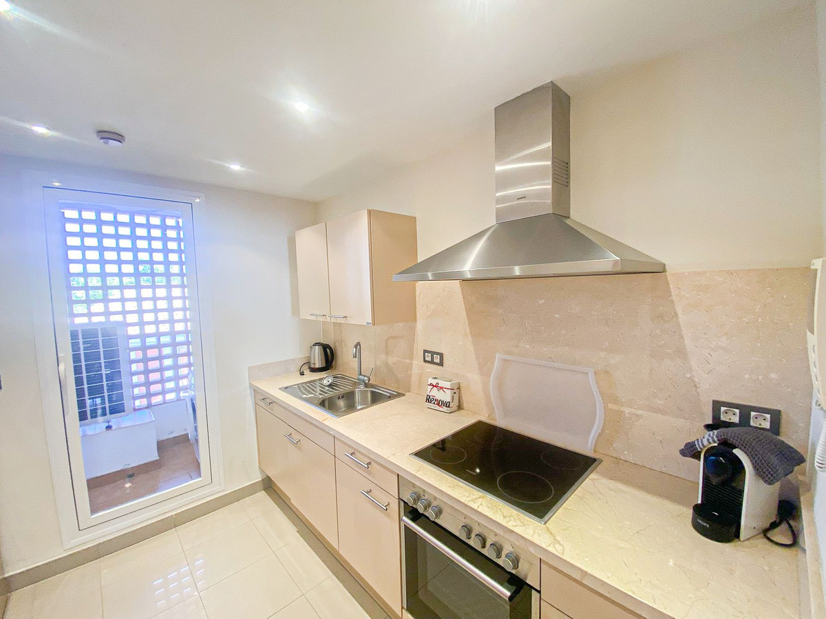 The kitchen, semi-separated from the living room, connects to a practical separate laundry area with a washing machine and dryer. The apartment has two terraces, ideal for enjoying the Costa del Sol climate all year round, one of which is equipped with a barbecue and beautiful views of the pool and communal garden.