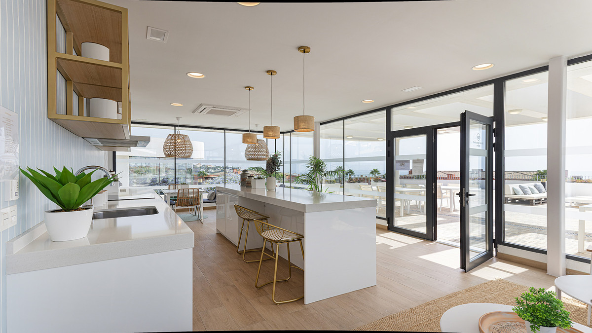 Straight ahead, the open-plan kitchen, dining, and living area is light-filled and modern, seamlessly leading out onto the large terrace, ideal for dining al fresco or enjoying the long, sunny Spanish afternoons while soaking in the stunning sea views.