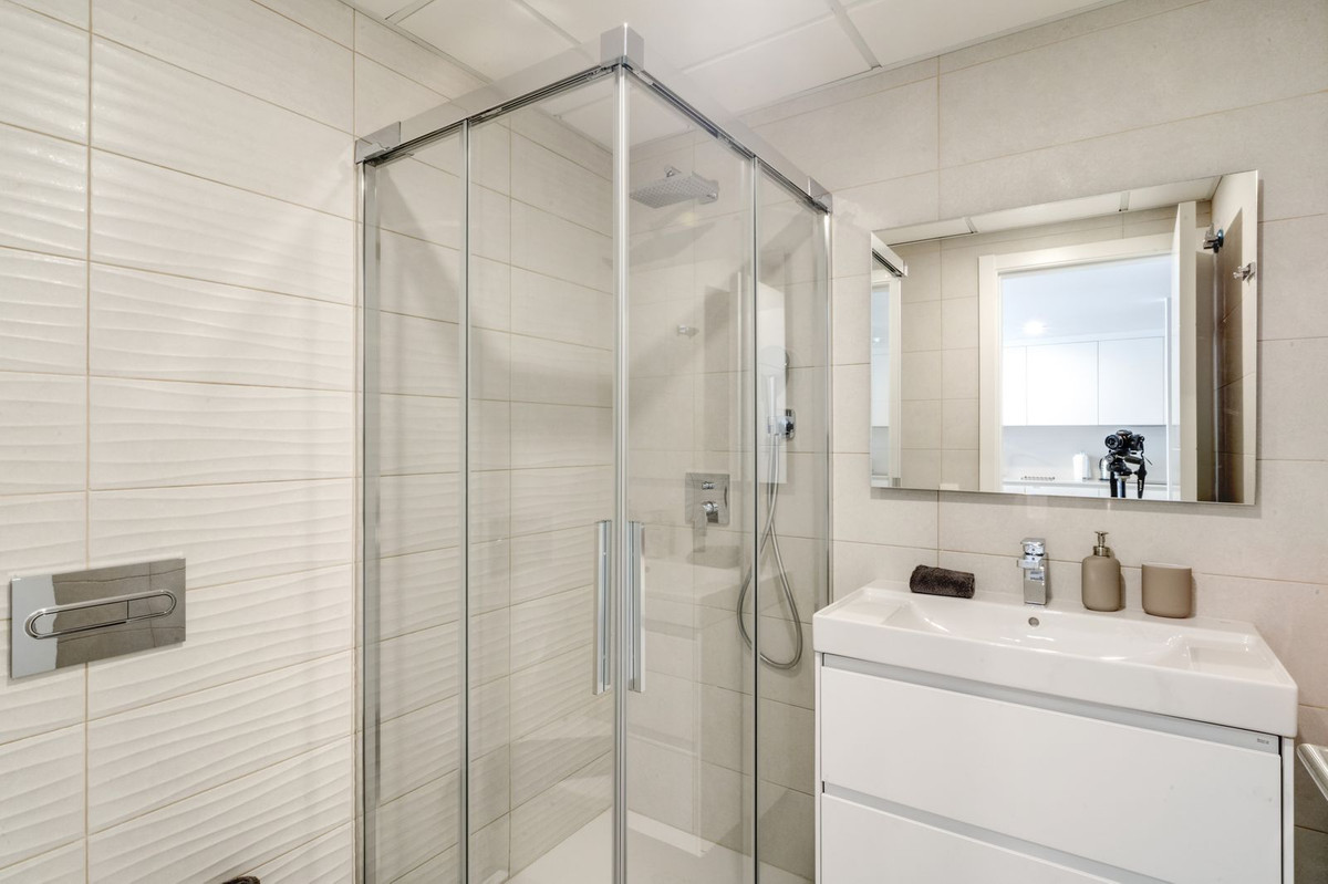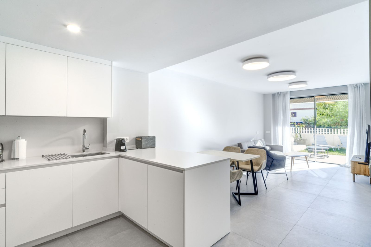 Spectacular two bedroom ground floor apartment in the brand new gated community Estrella Del Mar, Marbella. This beachside community is only 200m from the beach and in a privileged location close to services, leisure facilities, shops and restaurants. The community offers communal swimming pools, a gym and co working area. The property has an open plan living and dining area with access to a private terrace and garden; fully fitted open plan kitchen with laundry area; master suite with access to the terrace; guest bedroom; and a guest bathroom. Other features include a private parking space, storeroom, hot and cold air conditioning, electric blinds and full domotic system.