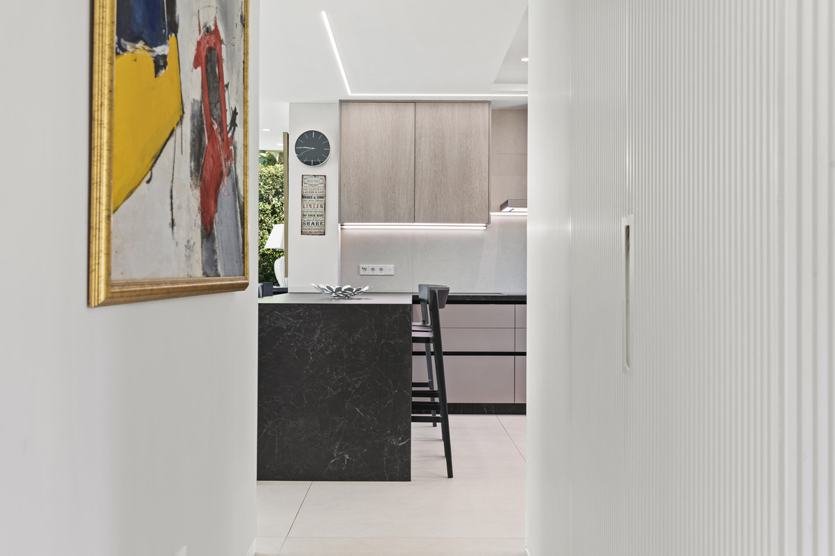 Un grand hall d'entrée ouvert mène aux pièces de vie lumineuses, avec leurs plafonds voûtés sublimés par un éclairage particulier, leurs carrelages grand format et leurs grandes baies vitrées qui s'ouvrent sur le jardin. La cuisine ouverte, élégante et fonctionnelle, avec son bar, communique harmonieusement avec la salle à manger et le salon. Le salon bénéficie également d'une cheminée à gaz moderne, créant un point focal chaleureux et élégant.