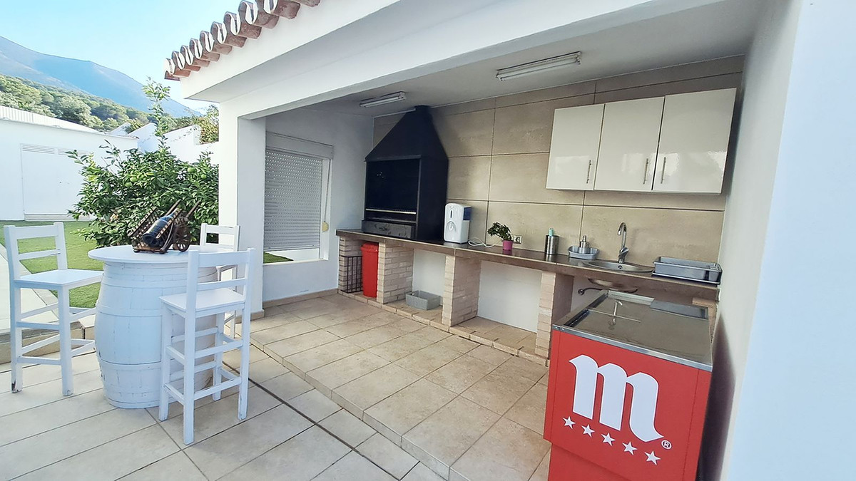 Depuis la terrasse couverte, vous avez accès au jardin magnifiquement entretenu avec une piscine de 50 m², une cuisine extérieure, un bar, une salle de douche, etc., où vous pourrez profiter en toute tranquillité du panorama impressionnant sur la campagne et les montagnes environnantes jusqu'à la baie de Malaga.