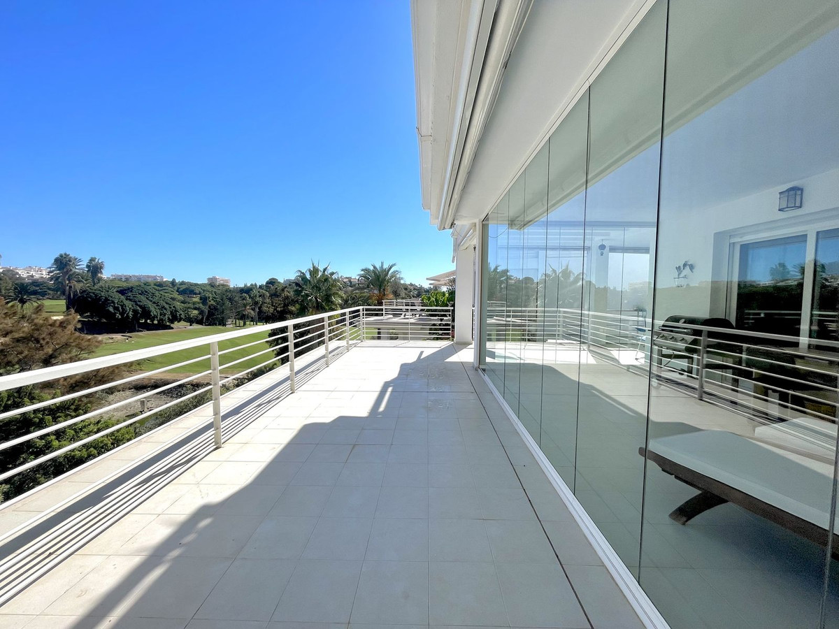 L'appartement comprend trois chambres doubles spacieuses, chacune donnant directement sur une terrasse, à l'avant ou à l'arrière de la propriété. Deux salles de bains bien aménagées, dotées de grandes douches à l'italienne, desservent l'appartement, dont une attenante à la chambre principale. À gauche du hall d'entrée, des portes doubles s'ouvrent sur un vaste séjour accueillant, agrémenté d'une cheminée et de baies vitrées qui inondent l'espace de lumière naturelle. Ces fenêtres donnent sur l'atout majeur de cette propriété : une immense terrasse panoramique. Partiellement fermée par des portes pliantes pour en profiter toute l'année, cette incroyable terrasse offre une vue imprenable sur le golf et la campagne environnante.