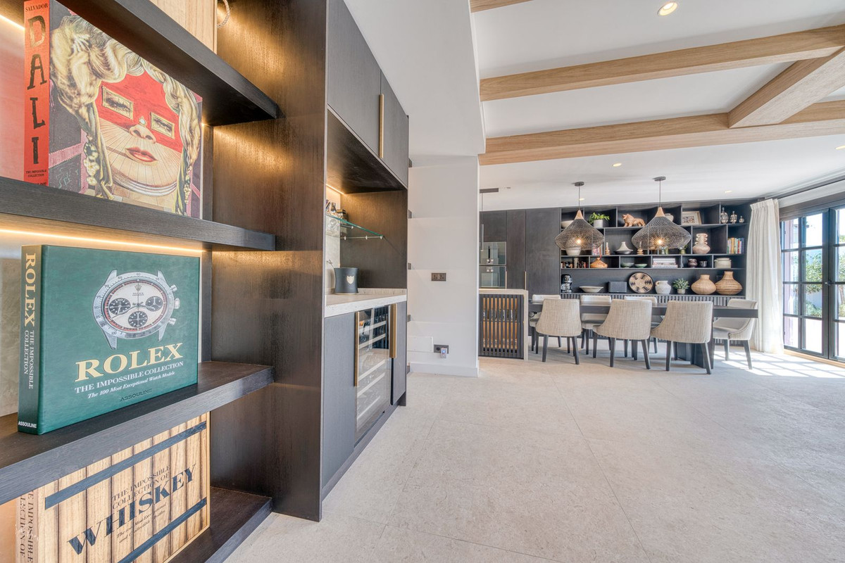 On accède à cette superbe demeure par une cour baignée de soleil, idéale pour les repas en plein air, et l'on découvre un intérieur où chaque détail a été soigneusement pensé. Le rez-de-chaussée, à la circulation fluide, abrite une cuisine design équipée d'appareils Gaggenau, un îlot central et une salle à manger spacieuse. Le salon ouvert est mis en valeur par des poutres apparentes en chêne blanchi et de larges baies vitrées coulissantes donnant sur une vaste terrasse, inondant l'espace de lumière et créant une harmonie parfaite entre intérieur et extérieur. Au niveau inférieur, le confort et les loisirs sont à l'honneur : un salon cinéma privé avec un canapé d'angle, une cuisine et un bar, une cave à vin et deux suites d'invités élégamment aménagées, chacune avec sa propre salle de bains et un accès à une terrasse couverte. À l'étage, la suite parentale offre un havre de paix avec un dressing, une salle de bains privative complète et une magnifique baignoire îlot. Une quatrième chambre complète ce niveau, idéale pour la famille ou des invités supplémentaires.