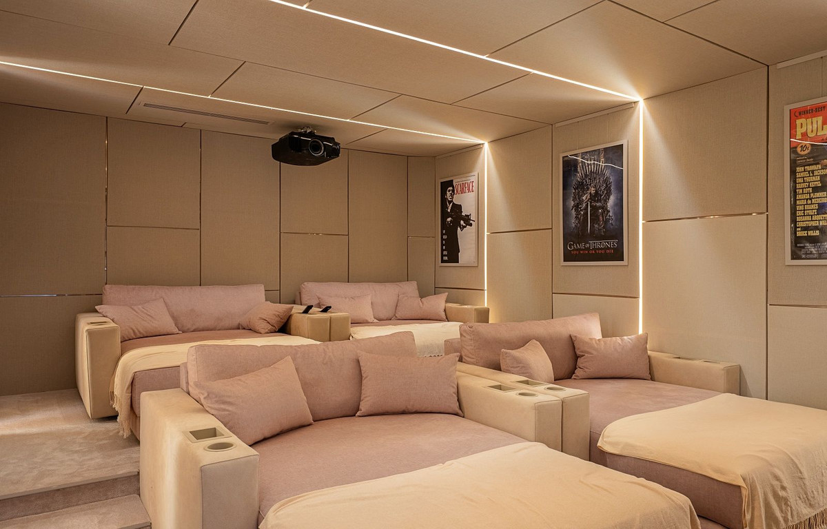 Le niveau inférieur de la villa abrite une quatrième chambre avec salle de bains, ainsi que de nombreux espaces de loisirs : salle de jeux, cave à vin impressionnante, salle de cinéma et salle de sport entièrement équipée. Un ascenseur privé dessert les trois niveaux de la maison pour un confort optimal.