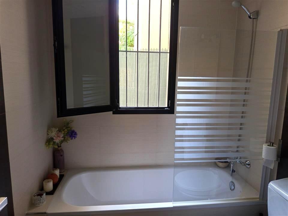 Trois chambres spacieuses et deux salles de bains complètes, dont une attenante avec baignoire balnéo et douche. Les deux salles de bains sont dotées de fenêtres donnant sur le jardin, assurant ainsi lumière naturelle et ventilation.