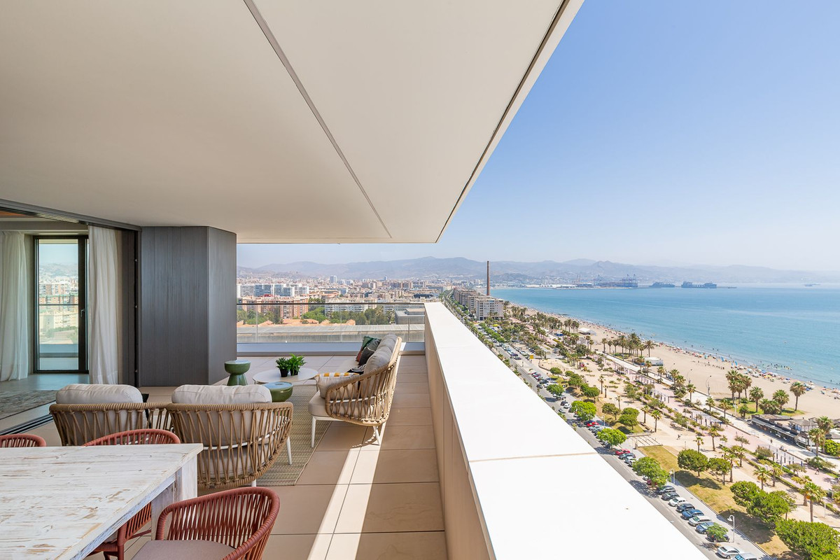 au port de Malaga. Le logement comprend une suite parentale avec vue sur mer, une deuxième chambre avec vue sur mer et salle de bains privative, ainsi que deux autres chambres partageant une salle de bains familiale. Parmi ses atouts majeurs figurent le système domotique ABB Freehome, la climatisation Daikin, le chauffage au sol et les stores Bandalux.