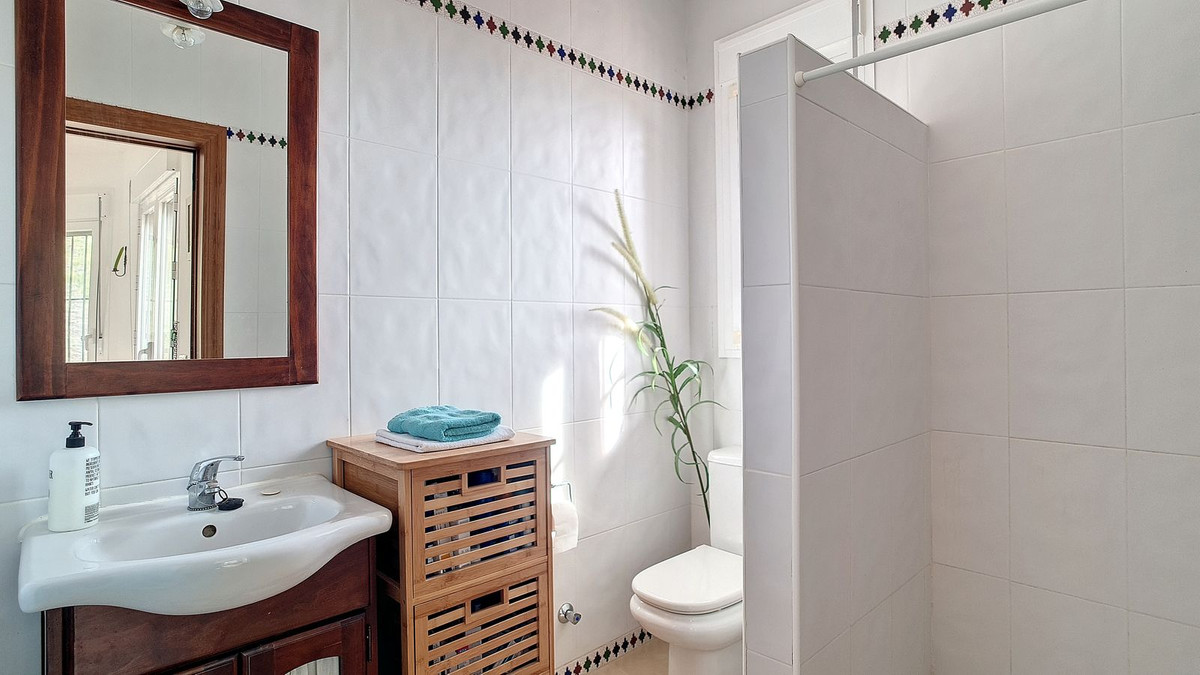 La villa comprend un séjour (coin salon et salle à manger) avec cuisine ouverte. Au rez-de-chaussée, elle offre deux chambres spacieuses, chacune avec sa propre salle de bains, ainsi qu'un cellier équipé d'un lave-linge et d'un espace de rangement pour le linge de maison. Un bel escalier dans le séjour mène au premier étage qui abrite une suite parentale spacieuse avec coin salon et espace détente, salle de bains privative avec baignoire/douche et dressing. La terrasse offre une vue imprenable sur les montagnes environnantes et la mer.