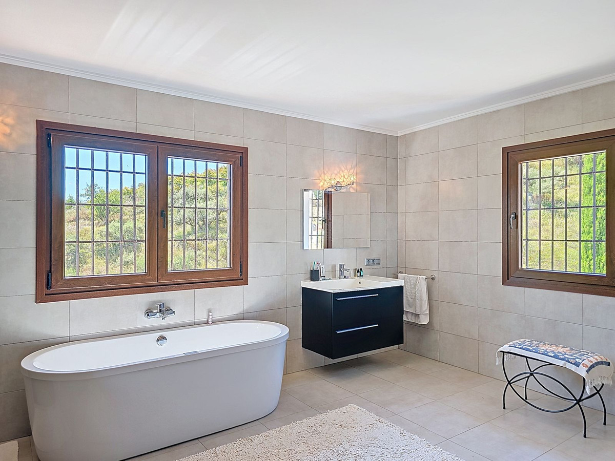 L'espace extérieur est un véritable paradis, avec plusieurs terrasses et une piscine privée rafraîchissante. Un atout unique est la cave à vin privée (bodega), située dans un espace souterrain naturel, où vous pourrez conserver vos vins préférés à température idéale. La villa allie durabilité et confort grâce à des panneaux solaires et une immense réserve d'eau de 160 000 litres.