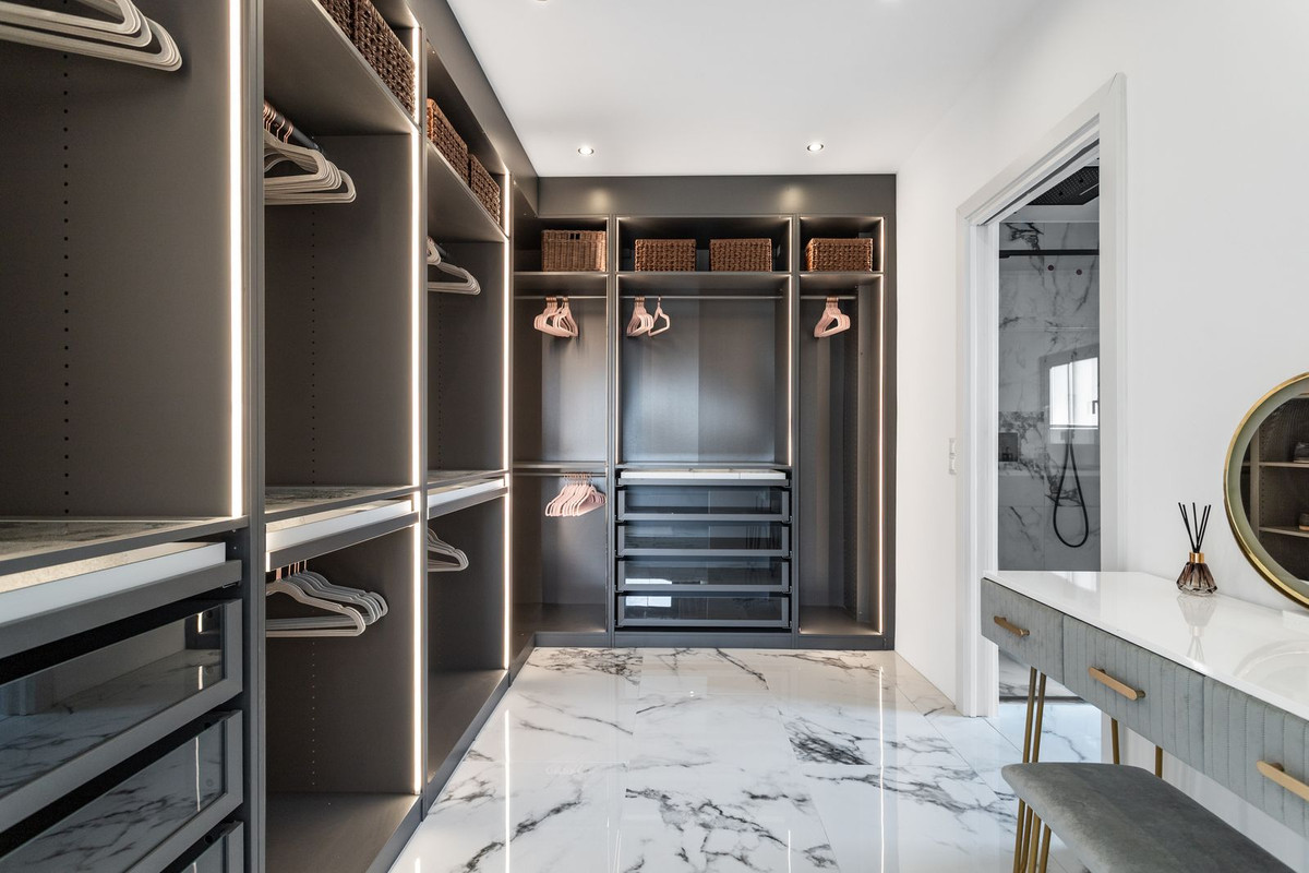 The villa offers four spacious bedrooms, three luxurious bathrooms, and a guest WC. The open-plan layout and impressive five-meter-high ceilings in the living room create a bright and airy atmosphere, enhanced by large windows that flood the interior with natural light and seamlessly blend indoor and outdoor living.