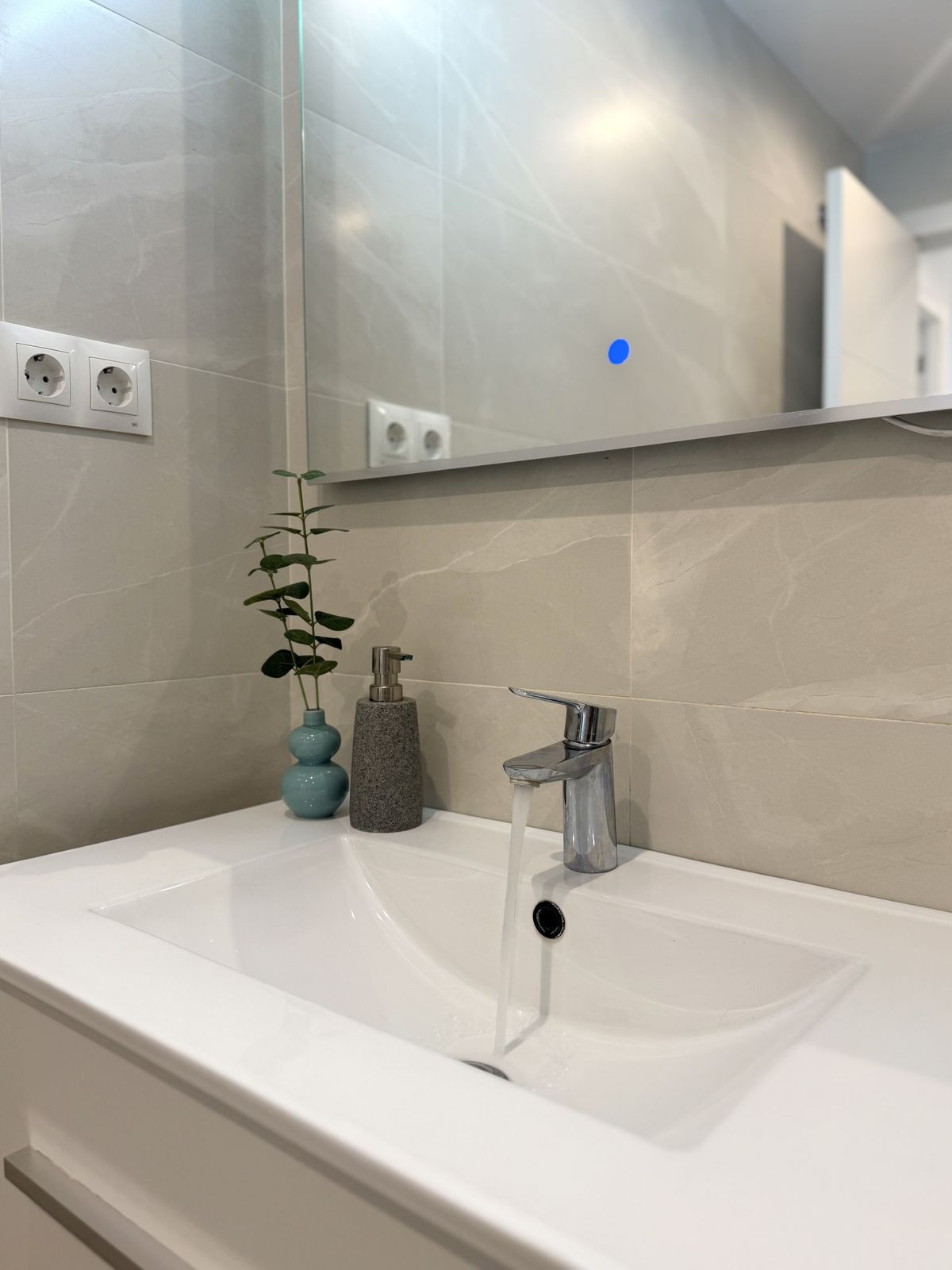 La chambre et la salle de bains moderne se trouvent plus loin dans l'appartement. De grandes fenêtres laissent entrer abondamment la lumière naturelle dans chaque pièce, et la climatisation assure un confort optimal toute l'année.