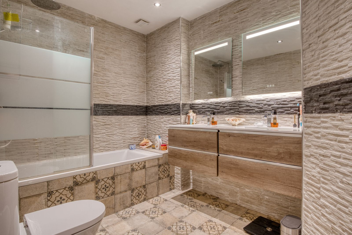La grande piscine privée et la généreuse terrasse au rez-de-chaussée offrent des options parfaites pour bronzer et se divertir. Un espace barbecue couvert permet de dîner en plein air, et le confort des invités est assuré par de multiples zones ombragées et une grande pergola. Le salon de l'appartement est actuellement configuré comme une salle de cinéma de luxe pour garantir un divertissement de premier ordre à toute la famille et aux invités pour chaque occasion.