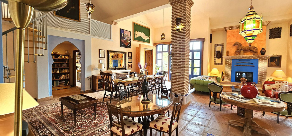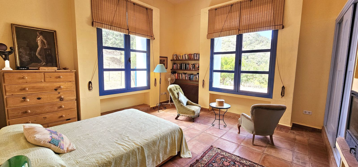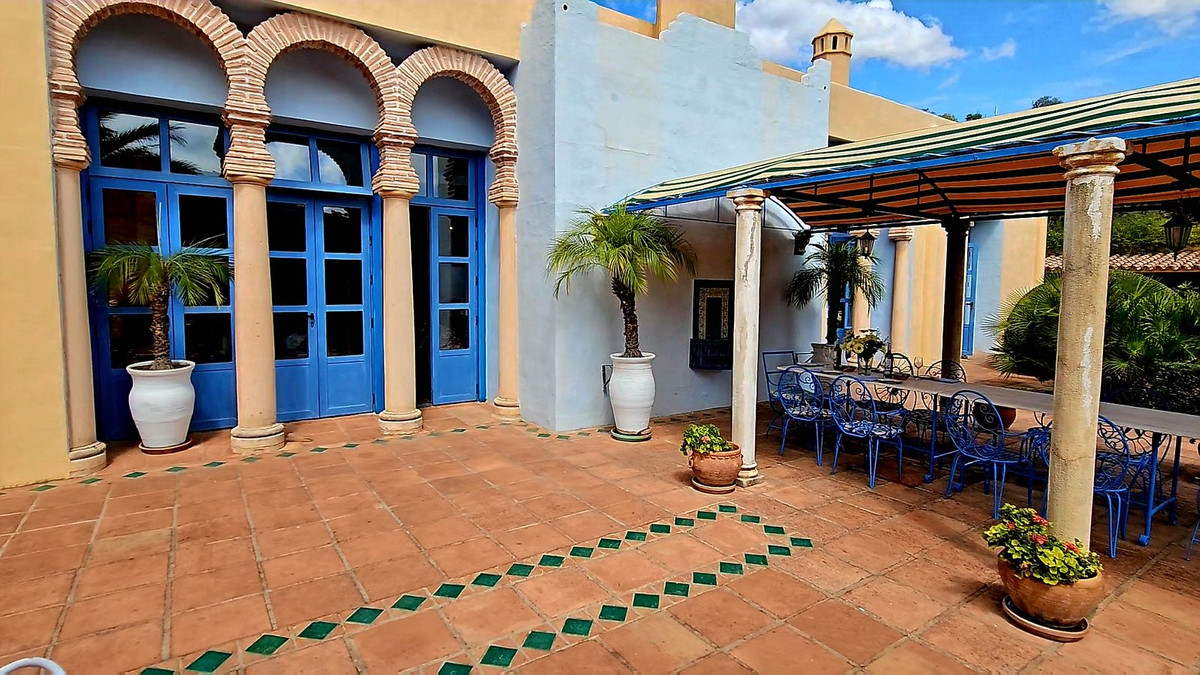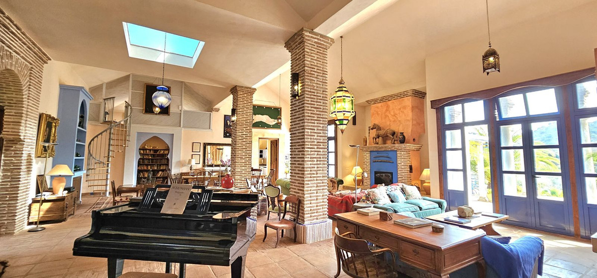 L'accès à la propriété se fait par un court chemin de terre menant à un portail électrique privé, partagé avec seulement quatre autres propriétés. En montant vers le sommet de la montagne, vous serez accueilli par une imposante porte ancienne en bois qui vous ouvre sur un hall d'entrée majestueux. De part et d'autre, vous trouverez deux chambres d'amis avec salle de bains privative. En face, le magnifique salon vous invite à la détente, astucieusement divisé en espaces distincts par d'élégants piliers : un coin salon accueillant avec une cheminée généreuse, une salle à manger attenante à la cuisine bien équipée et un coin lecture ou musique confortable. Des portes-fenêtres s'ouvrent harmonieusement sur la terrasse, offrant une vue imprenable sur le paysage et les montagnes environnantes. Lorsque toutes les portes sont ouvertes, la frontière entre intérieur et extérieur s'estompe, vous permettant de savourer pleinement le style de vie andalou en plein air.
