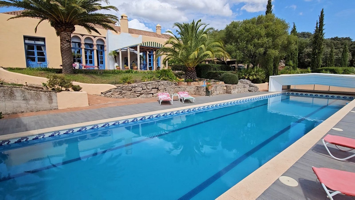 Entourée d'un jardin paysager champêtre agrémenté de palmiers et de cyprès, la maison principale communique harmonieusement avec l'espace piscine par une vaste terrasse. De larges marches et une rampe mènent à l'impressionnante piscine de 20 x 5 m, qui peut être couverte par un toit rétractable de type serre et chauffée pour en profiter toute l'année. L'espace piscine est agrémenté de terrasses ensoleillées et de fleurs éclatantes. Un pool house avec douche, pouvant également servir de salle de sport, complète ce havre de paix extérieur.