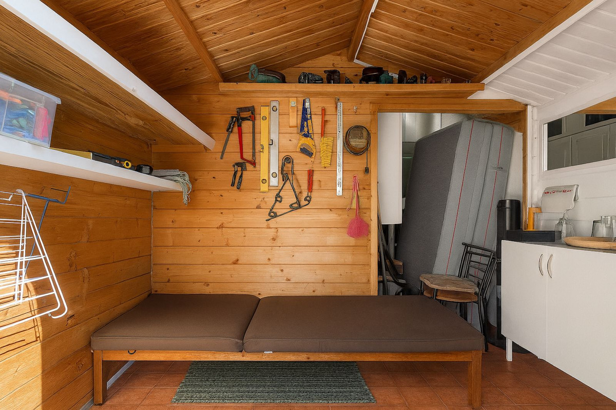 De plus, la terrasse supérieure comprend une petite cabane qui sert actuellement d'atelier et de débarras, mais qui dispose d'une minuscule kitchenette, offrant la possibilité d'être convertie en studio indépendant ou en chambre d'amis.