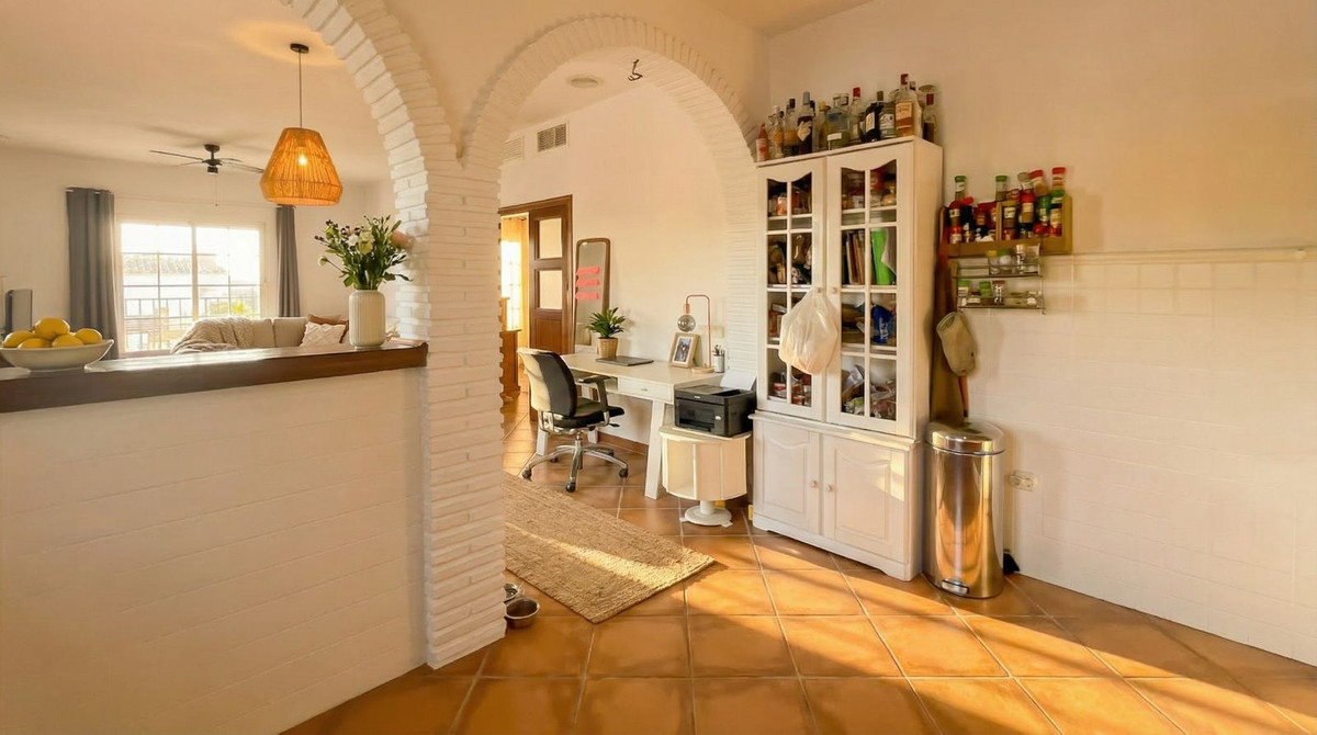 À l'intérieur, la villa dégage un charme andalou chaleureux, avec ses sols en terre cuite et ses élégantes arcades, combinés à un agencement ouvert donnant directement sur la terrasse et la piscine. L'espace de vie se compose d'une cuisine ouverte avec un bar et d'un salon spacieux et accueillant.