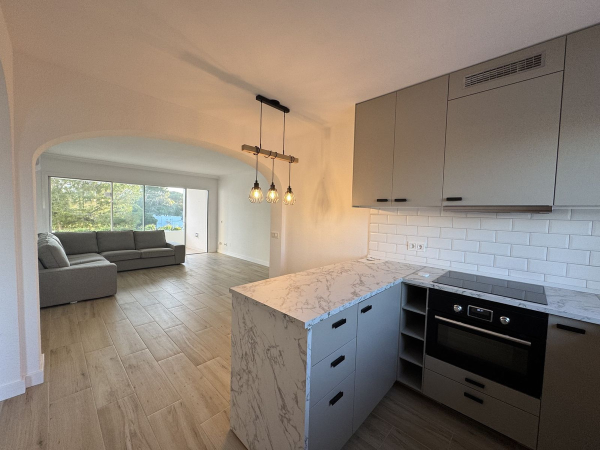 Cet appartement comprend deux chambres, une salle de bains, un intérieur moderne et rénové, et bénéficie d'une orientation sud-ouest, offrant une luminosité exceptionnelle et de magnifiques couchers de soleil. Le séjour offre une vue imprenable sur la mer et le jardin tropical.