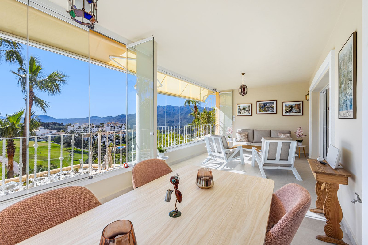 Le complexe immobilier est exceptionnellement bien entretenu, offrant une sensation d'espace et une vue imprenable sur le golf et les montagnes. Il s'apparente davantage à un manoir qu'à un complexe d'appartements espagnol typique. Les équipements communs comprennent le Wi-Fi dans tout l'immeuble, une mini-salle de sport, un sauna, une laverie, des espaces de détente couverts, des jardins tropicaux et une piscine attrayante. À voir absolument.