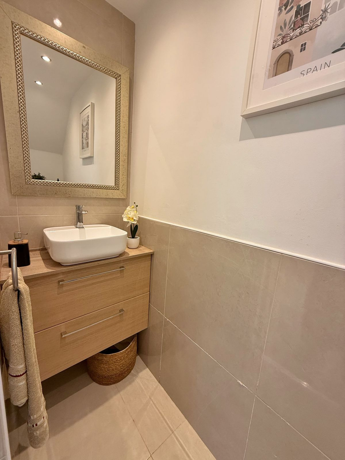 Elle comprend deux chambres extérieures avec placards intégrés, la chambre principale bénéficiant d'une salle de bains privative et d'un accès direct à une terrasse privée. La maison dispose également de deux salles de bains complètes et de toilettes pour invités.