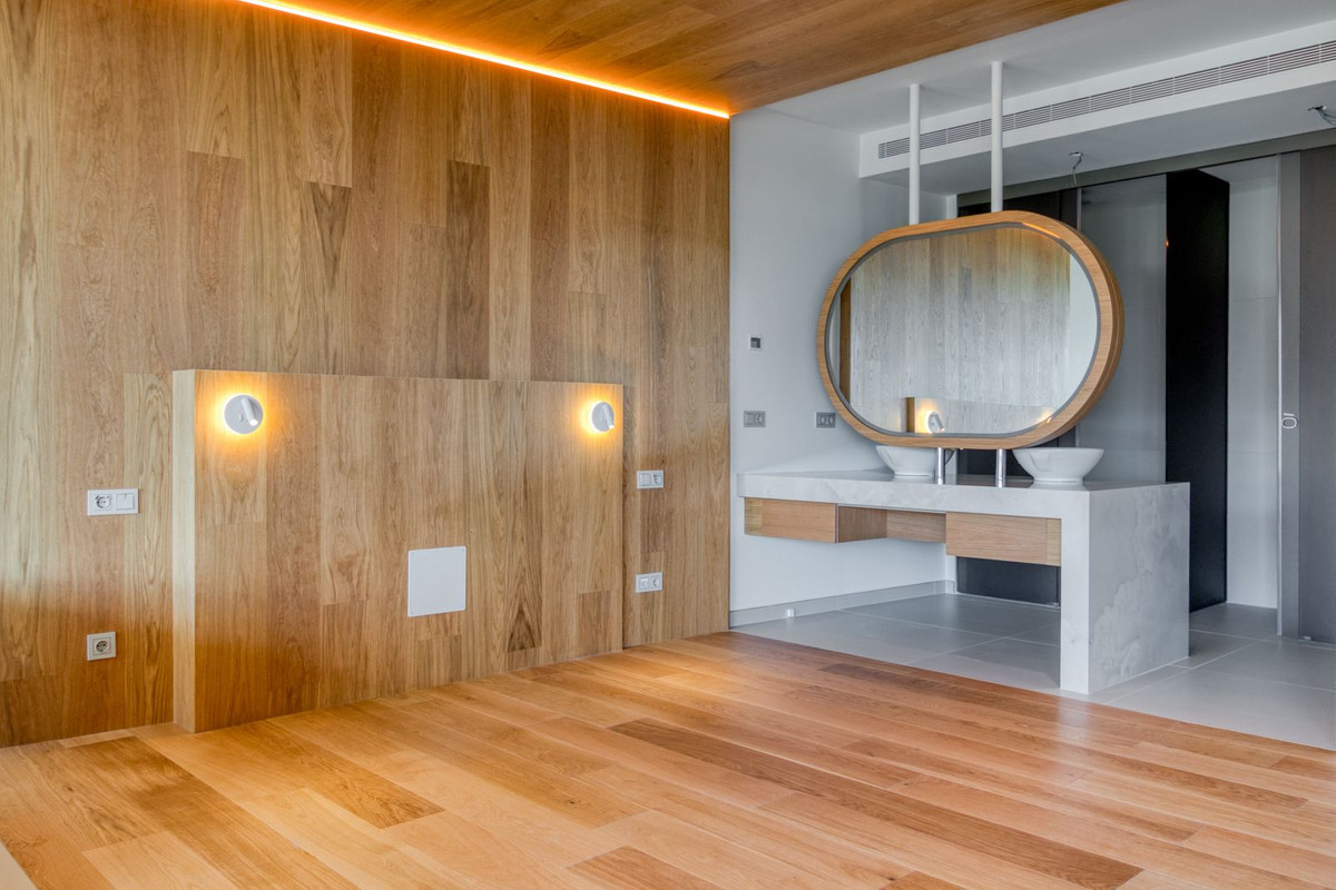 L'intérieur allie une architecture moderne et épurée à des finitions chaleureuses et haut de gamme. Les baies vitrées, du sol au plafond, accentuent la sensation d'espace et de luminosité, créant une transition harmonieuse entre l'intérieur et l'extérieur.