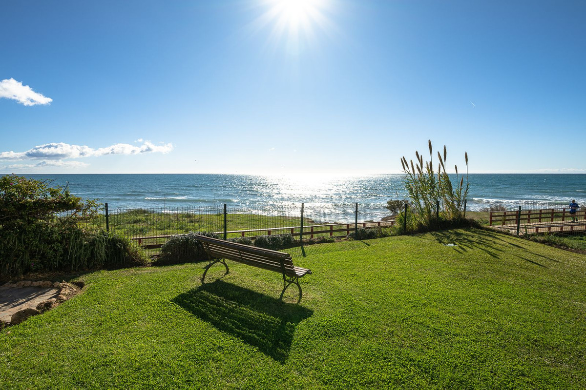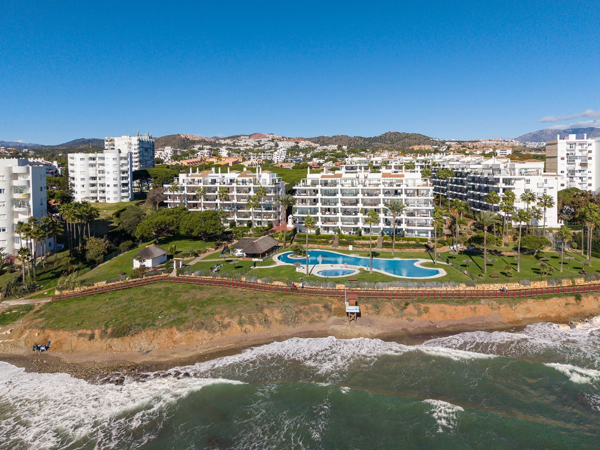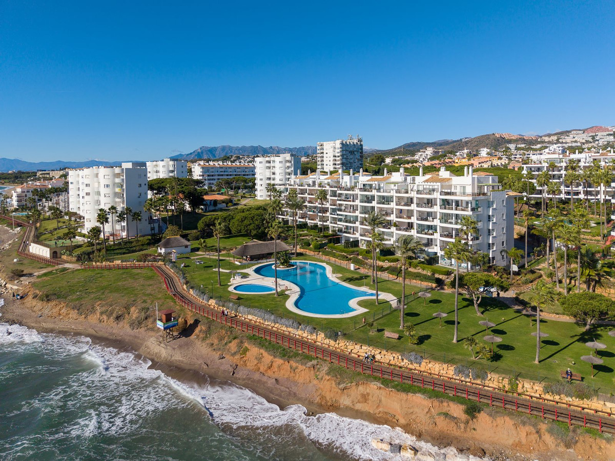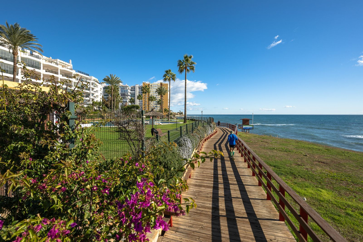 L'ensemble du complexe est orienté vers la mer et offre de vastes espaces extérieurs aménagés avec des bancs et de nombreux transats, à l'ombre ou au soleil. Les résidents peuvent utiliser leurs propres transats ou en louer au bar de la piscine. Le complexe dispose de deux accès directs à la promenade du front de mer, dont l'un est équipé d'une rampe d'accès pour les personnes à mobilité réduite et les poussettes. De là, vous pourrez profiter de magnifiques promenades reliant Fuengirola et La Cala de Mijas à Cabopino et Marbella.