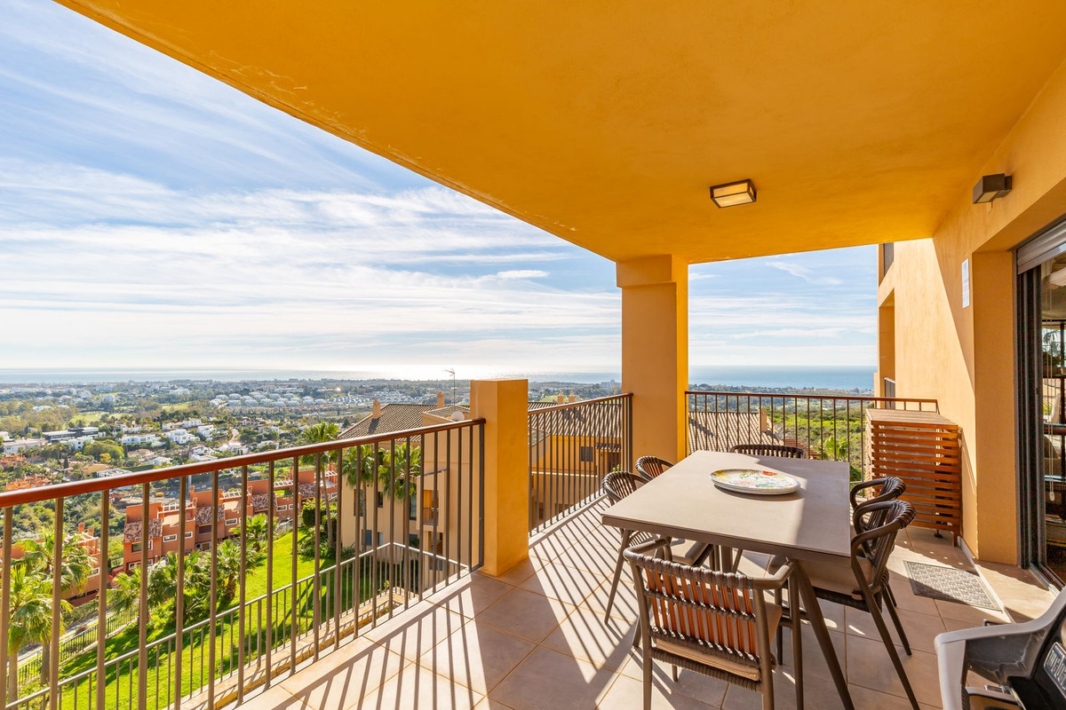 Grâce à sa situation en angle, l'appartement bénéficie d'une vue panoramique imprenable sur la mer Méditerranée, les terrains de golf, les montagnes environnantes et l'emblématique La Concha, offrant un paysage en perpétuelle transformation du lever au coucher du soleil. Son emplacement en étage intermédiaire, légèrement surélevé, accentue la sensation d'espace et la vue dégagée.