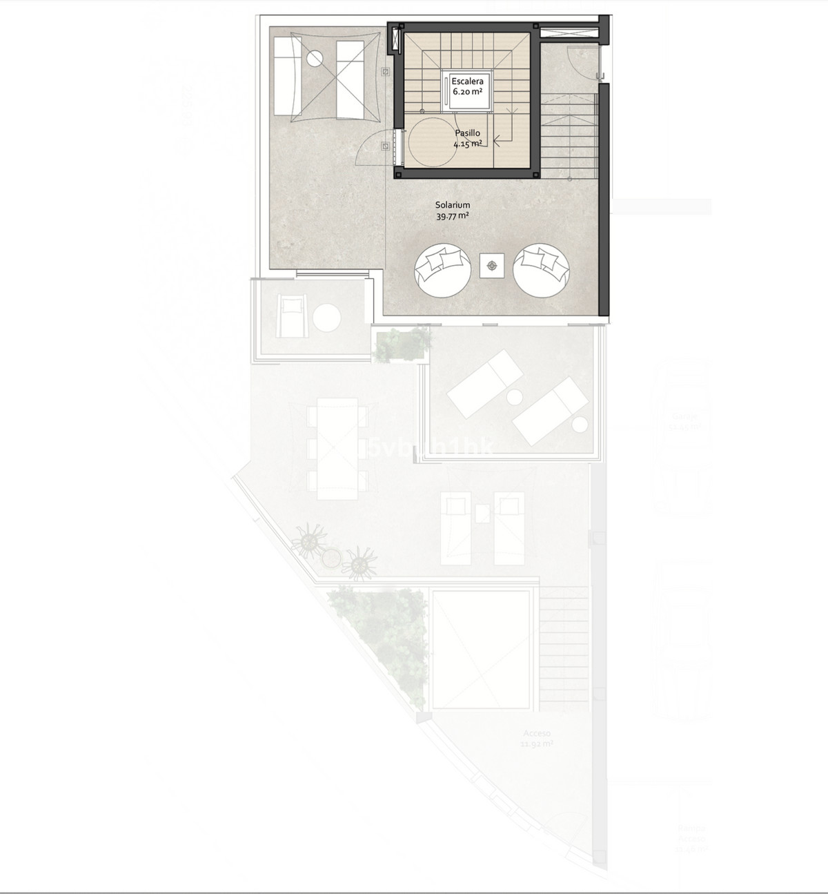 Le solarium privé de 40 m² sur le toit offre un espace unique pour se détendre, avec un accès direct à la piscine commune et une pré-installation pour un jacuzzi, ce qui le rend idéal pour profiter des couchers de soleil et de la vie en plein air.