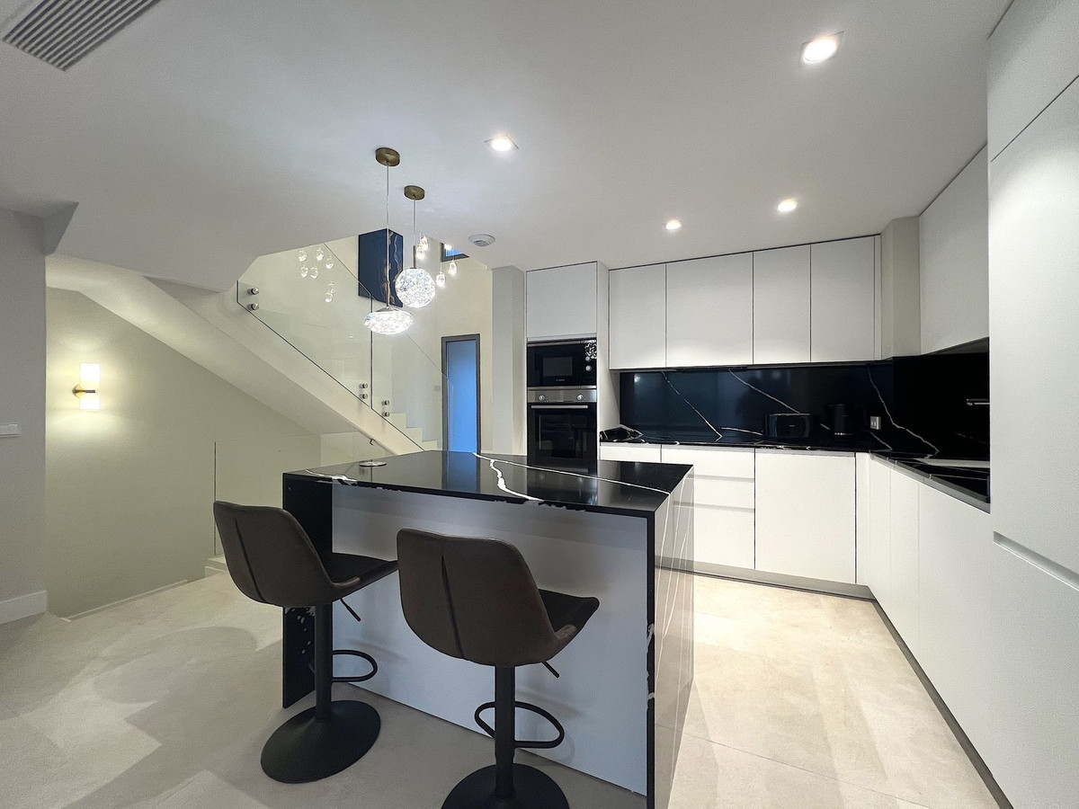 Le cœur de la maison est un espace lumineux et ouvert où la cuisine design, avec ses meubles blancs, ses touches de marbre onyx, son îlot central et ses appareils Bosch, se prolonge harmonieusement vers un élégant salon dominé par une cheminée à gaz occupant tout un mur. De là, on accède à une vaste terrasse exposée plein sud, idéale pour admirer les couchers de soleil et profiter du soleil tout au long de la journée.