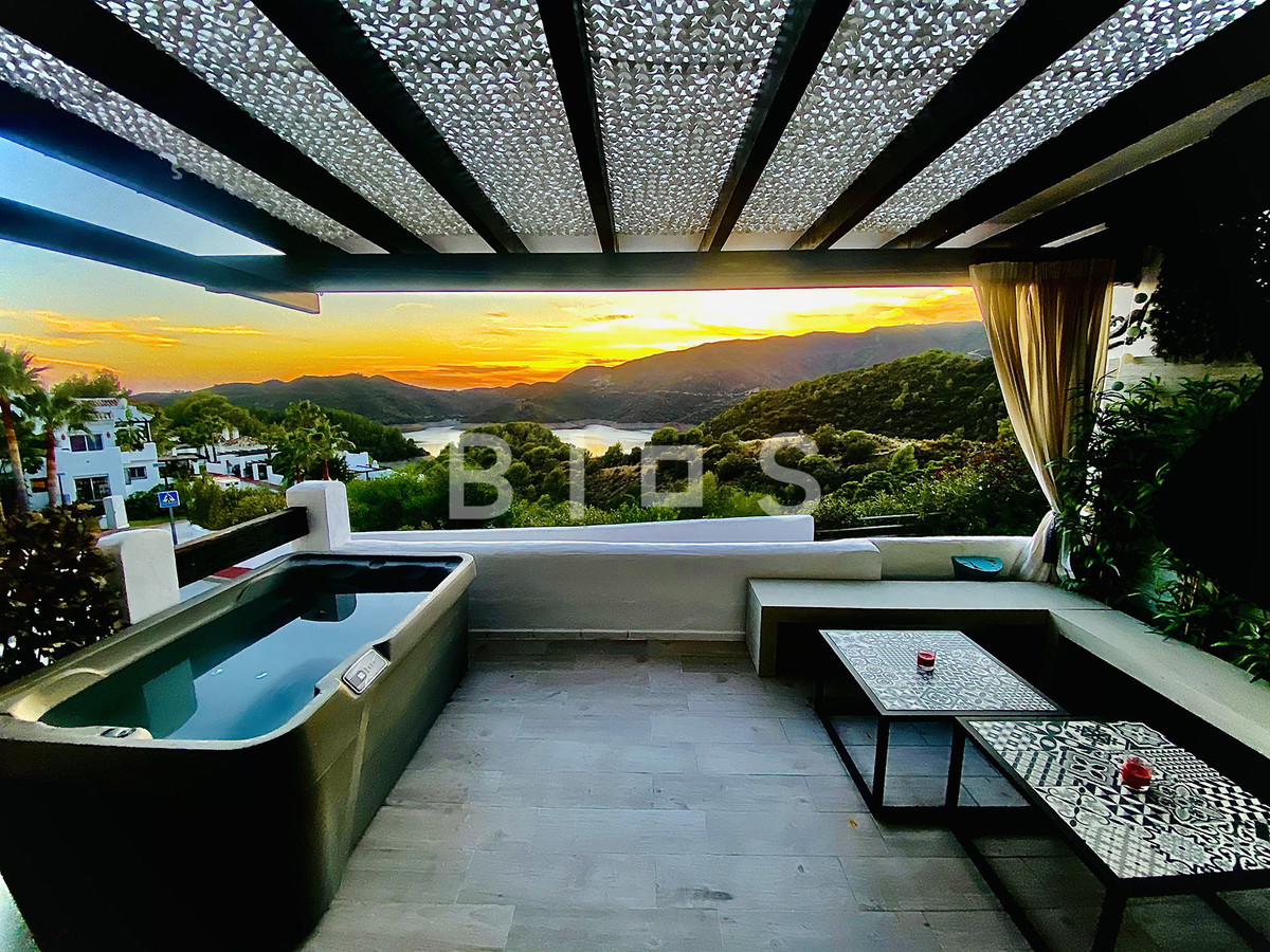 Située dans le prestigieux domaine privé et sécurisé de Zahara de Istán, à quelques minutes de Marbella, cette maison jumelée est un véritable havre de luxe sur la côte andalouse. Dès l'entrée dans le domaine, la tranquillité et l'intimité de ce lieu paisible sont immédiatement perceptibles. La maison, qui se distingue par ses vues imprenables sur le lac et les montagnes environnantes, s'ouvre sur un séjour spacieux et lumineux, un espace idéal pour profiter pleinement de la nature environnante. La cuisine, ouverte sur le séjour, est entièrement équipée et agrémentée d'une cheminée qui chauffe tout l'étage, créant une atmosphère chaleureuse et conviviale. À ce niveau se trouvent également une élégante salle à manger, une salle de bains et une magnifique terrasse, d'où l'on peut admirer des couchers de soleil inoubliables. La terrasse est équipée d'un jacuzzi et d'un coin salon confortable, parfait pour se détendre en plein air.