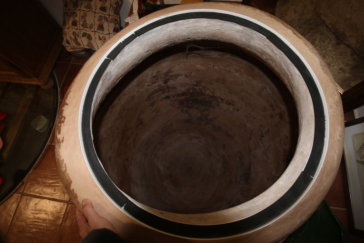 Une salle de stockage historique contenant des jarres en terre cuite parfaitement conservées, vieilles de plus de 200 ans, utilisées pour la production de vin