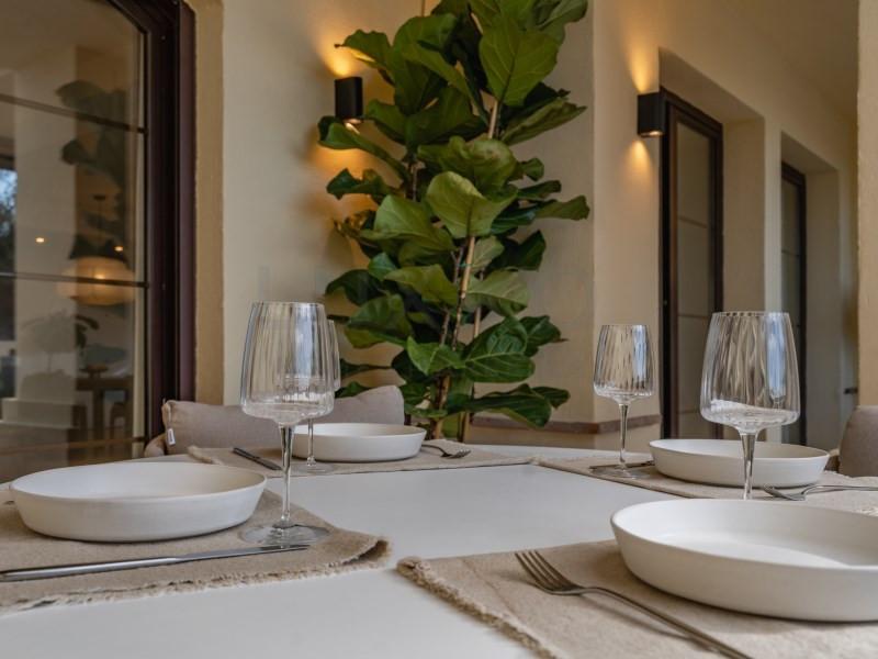 Both the living room and the kitchen open directly onto a generous covered terrace. The terrace is set up with a comfortable lounge area as well as a cosy seating space, with easy access to the kitchen. Thanks to the perfect balance of sun and shade, it is an ideal outdoor space to enjoy all year round, while helping to keep the apartment pleasantly cool.
