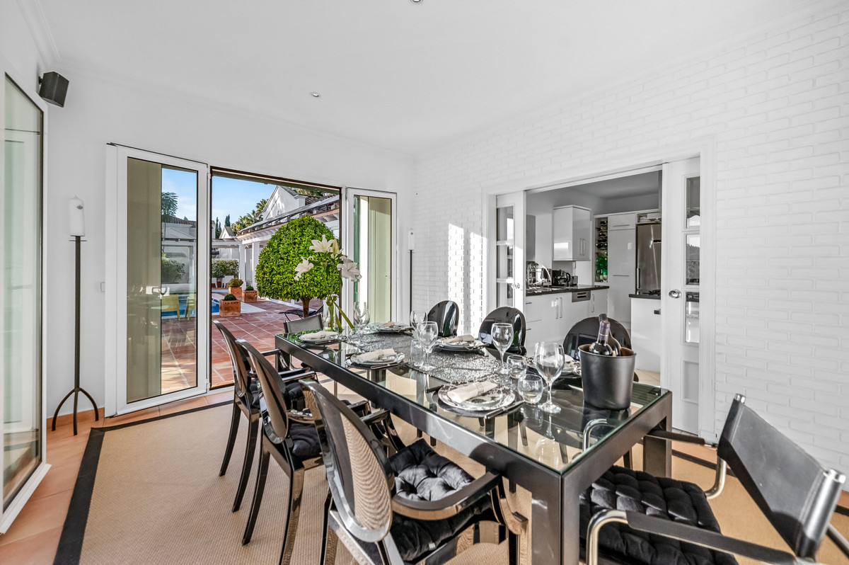 De retour au rez-de-chaussée, la maison se poursuit par une salle à manger attenante qui communique harmonieusement avec la cuisine. Celle-ci s'ouvre sur une salle de petit-déjeuner séparée, baignée de lumière naturelle grâce à ses nombreuses fenêtres offrant une vue sur le jardin et la piscine.
