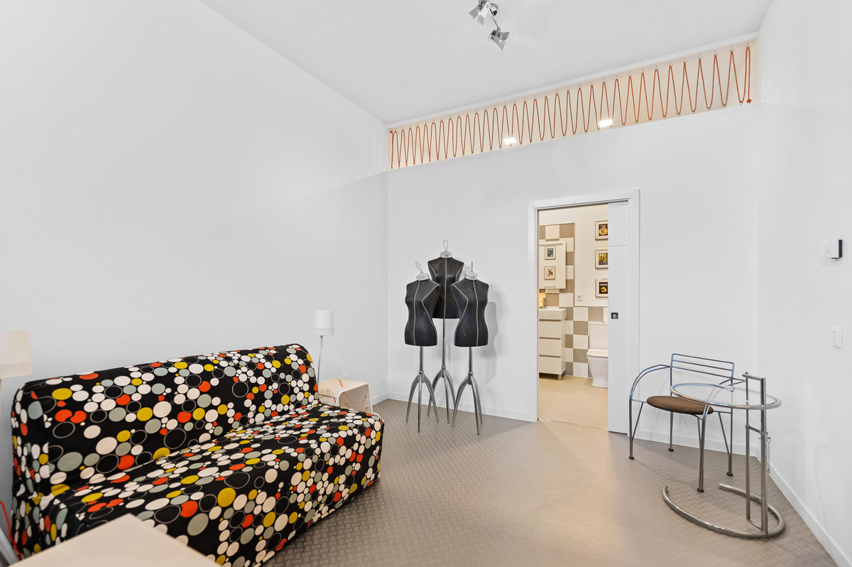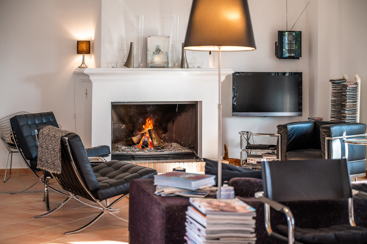 En suivant la cour sur la gauche, l'une des chambres avec salle de bains privative est actuellement aménagée en salle de musique. Un piano jaune original y apporte une touche chaleureuse et pleine de caractère. En continuant tout droit, le salon principal s'ouvre sur une pièce à vivre spacieuse, meublée avec goût et organisée autour d'une cheminée remarquable. Un côté de la pièce se prolonge naturellement vers un coin bibliothèque, dont un mur entier est consacré aux livres et magazines, créant une atmosphère calme et accueillante.