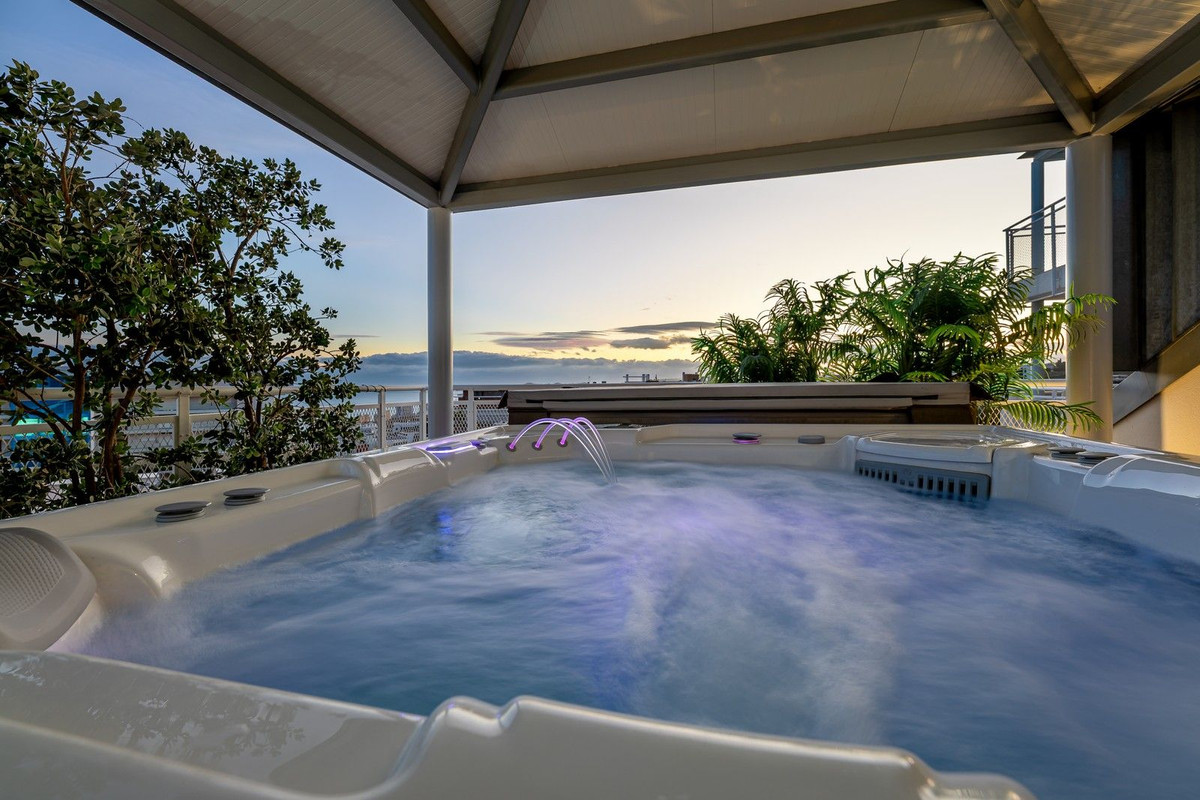 La vaste terrasse semble faire corps avec l'espace intérieur, avec une cuisine et un bar extérieurs, un espace repas couvert et vitré agrémenté d'un spa/jacuzzi luxueux et d'une douche sous un toit.