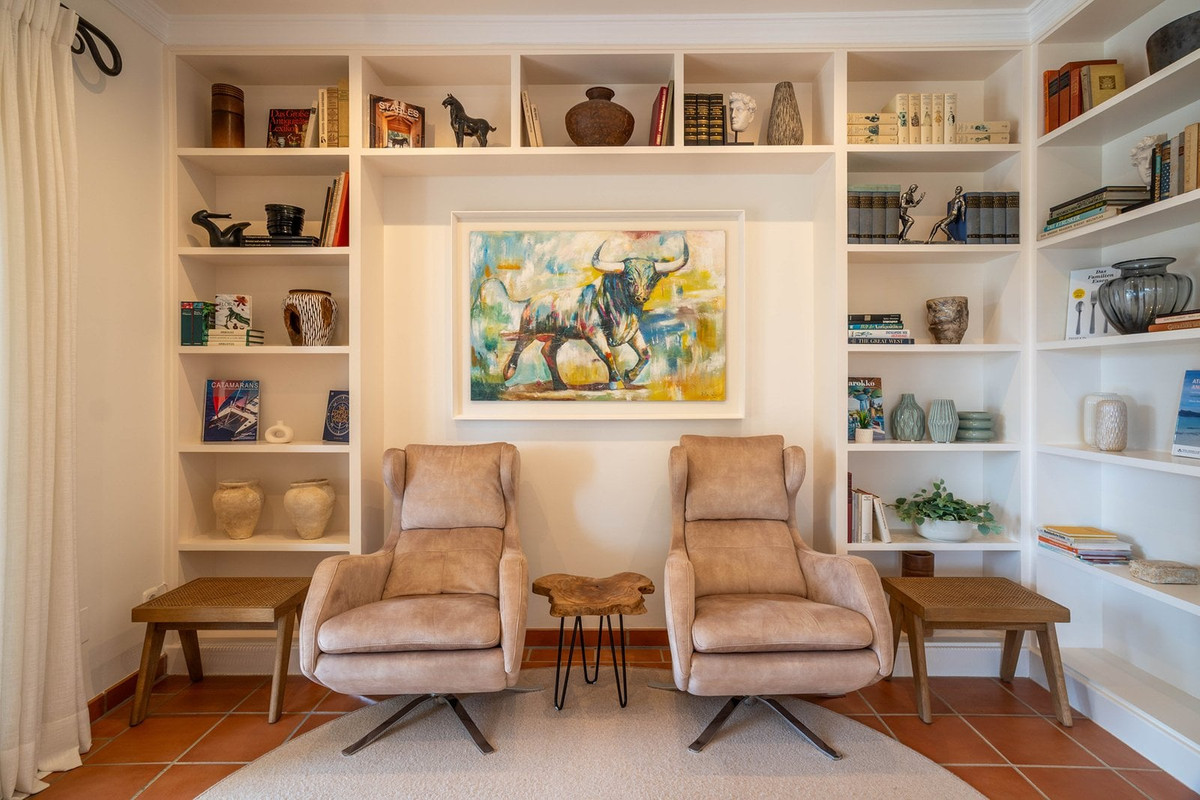 L'hébergement comprend trois chambres spacieuses avec salle de bains privative, ainsi qu'une pièce polyvalente pouvant servir de chambre, de chambre d'enfant, de bureau ou de salon. Une bibliothèque séparée offre une flexibilité supplémentaire et peut facilement être transformée en chambre ou en espace de travail. La suite principale dispose d'un dressing et offre une vue imprenable sur le paysage environnant.