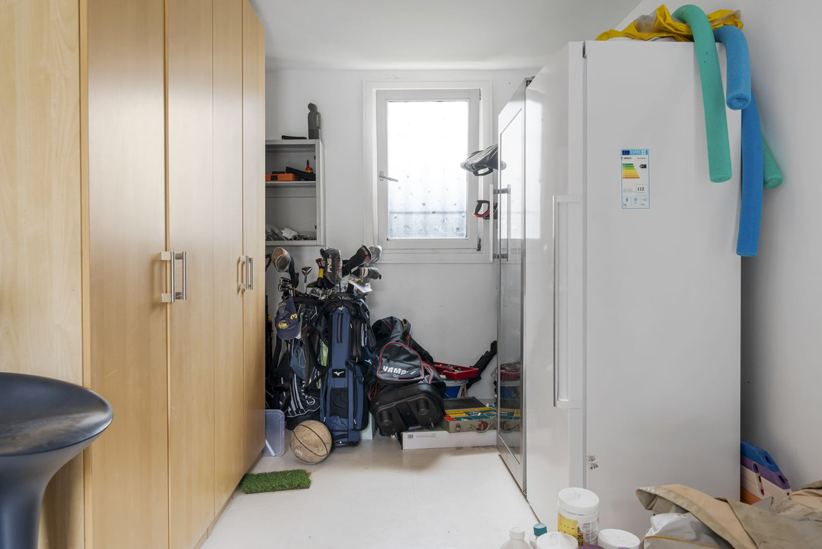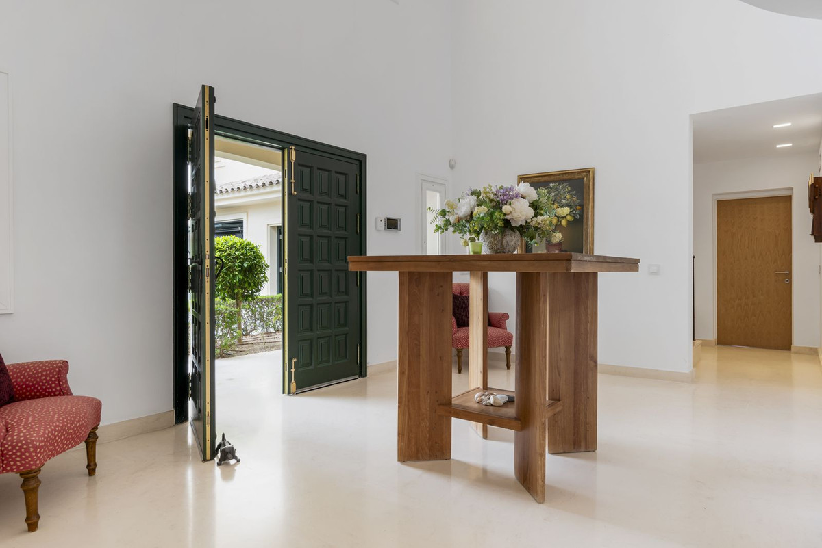 En entrant, vous êtes accueilli par un hall d'entrée à double volume qui mène à une spacieuse cuisine ouverte et un salon formel, tous deux s'ouvrant sur un patio couvert avec accès aux jardins et à la piscine. Le rez-de-chaussée comprend également une salle à manger formelle, une buanderie séparée, une salle de bains de service et de nombreux espaces de rangement. Dans l'aile droite, se trouvent une très grande chambre principale avec dressing, salle de bains en suite et accès direct aux jardins et à la piscine, un bureau privé, ainsi qu'une suite privée supplémentaire avec une chambre et salle de bains. salle de bains privative.