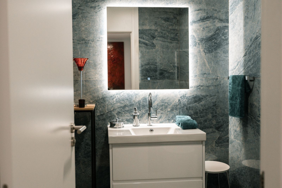 Cette propriété comprend trois chambres spacieuses avec salles de bains privatives et placards intégrés, ainsi qu'une salle de bains supplémentaire pour les invités. Le sol en marbre haut de gamme garantit durabilité et facilité d'entretien.