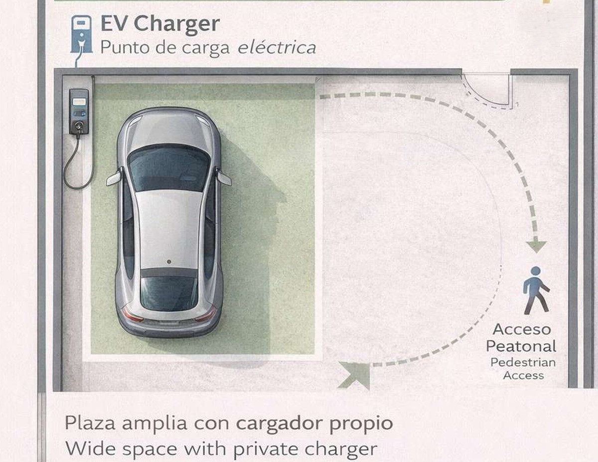 Un emplacement de garage privé est inclus dans le prix, avec possibilité de recharge pour véhicule électrique.