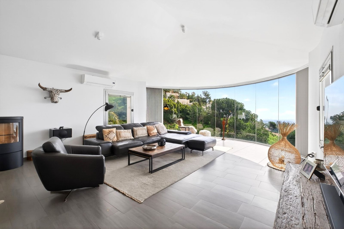 L'emblématique baie vitrée semi-circulaire délimite l'espace de vie principal, offrant une vue imprenable sur la mer et les montagnes.
