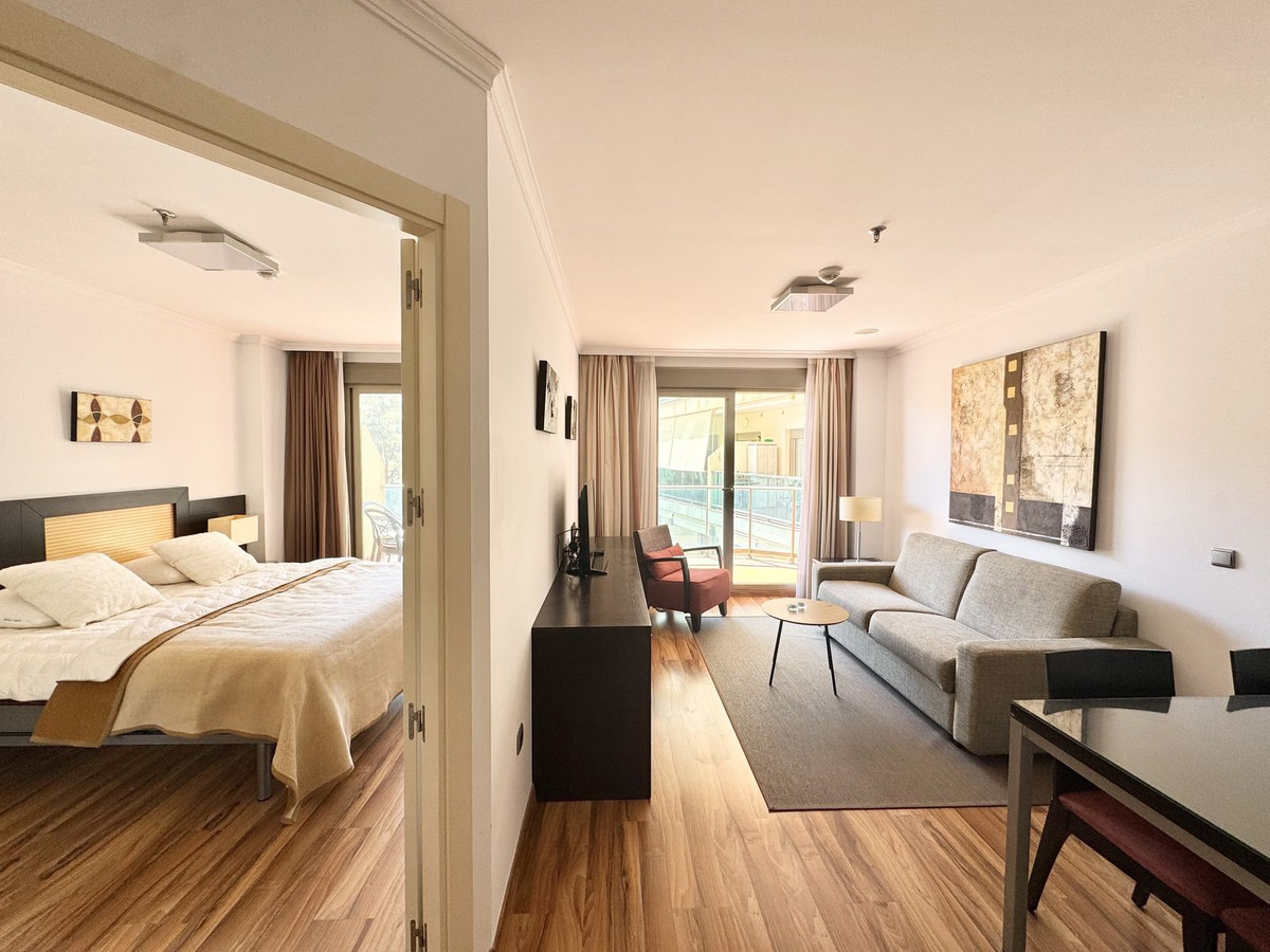 Depuis le salon, vous accédez à un agréable balcon exposé sud/ouest, où vous pourrez profiter du soleil presque toute la journée, ainsi que d'une vue sur la piscine et d'une vue partielle sur la mer.