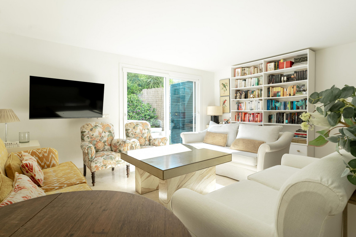 The main floor flows seamlessly into the outdoor terrace and a private, enclosed garden that wraps around the house, creating a secure oasis where children can play freely and you can even enjoy fresh almonds from your own backyard tree. Featuring four spacious bedrooms and four bathrooms, the layout guarantees privacy by dedicating the upper levels to the sleeping quarters. From the first and second floors, the home offers pleasant sea views and vistas of the green fairways, providing the perfect setting for a peaceful home office or a tranquil retreat.