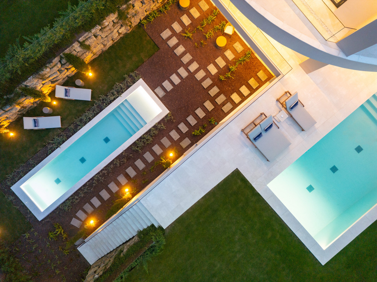 Le niveau inférieur est dédié aux loisirs et à la fonctionnalité : il comprend une salle de sport entièrement équipée, une cave à vin sur mesure, un second salon et une cuisine supplémentaire avec coin bar. Ce niveau abrite également deux chambres d'amis avec salle de bains privative et accès direct à une piscine secondaire et aux jardins paysagers, offrant ainsi un havre de paix aux invités. Un garage pour trois voitures et des toilettes complètent cet étage.