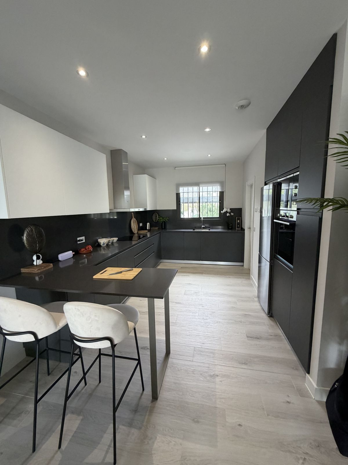 Cuisine moderne entièrement équipée et buanderie séparée.