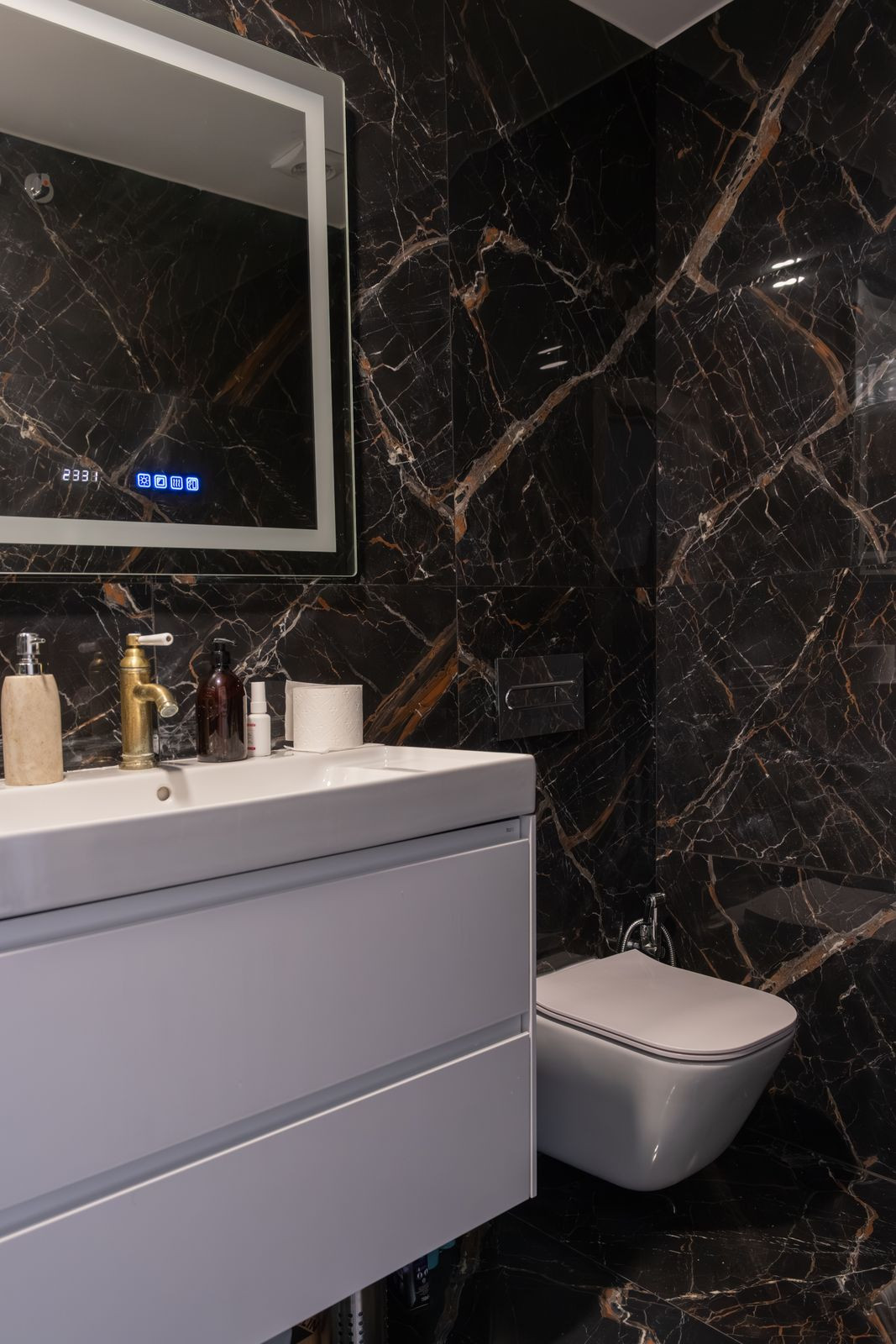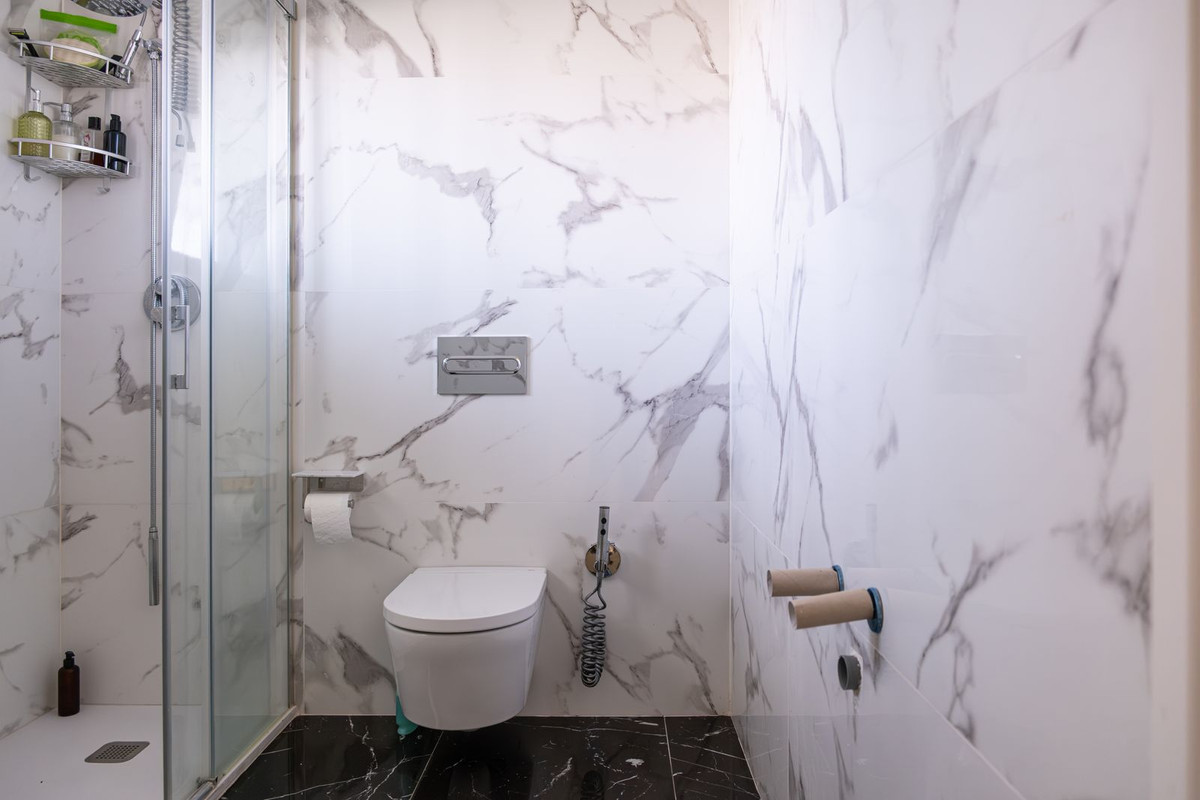 Au rez-de-chaussée, un salon spacieux et lumineux avec cuisine ouverte vous accueille. Conçu comme un espace convivial et ouvert, il est idéal pour le quotidien comme pour les réunions de famille et entre amis. Ses grandes fenêtres laissent entrer une abondante lumière naturelle tout au long de la journée et offrent une vue imprenable sur la mer, transformant chaque instant en un moment unique. À ce même étage se trouve également une salle de bain complète aux dimensions généreuses, aménagée avec des matériaux de haute qualité et un souci du détail exceptionnel.