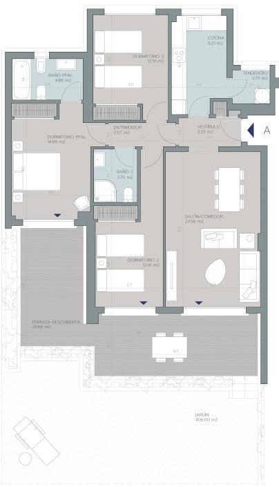 Rez de chaussée, non meublé, cuisine équipée, Underground parking, piscine communautaire, Jardin: Privé et commun, Orientation: Ouest