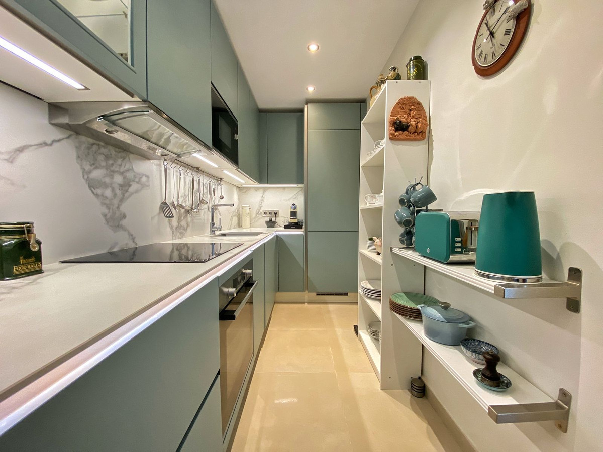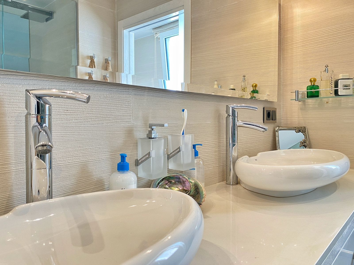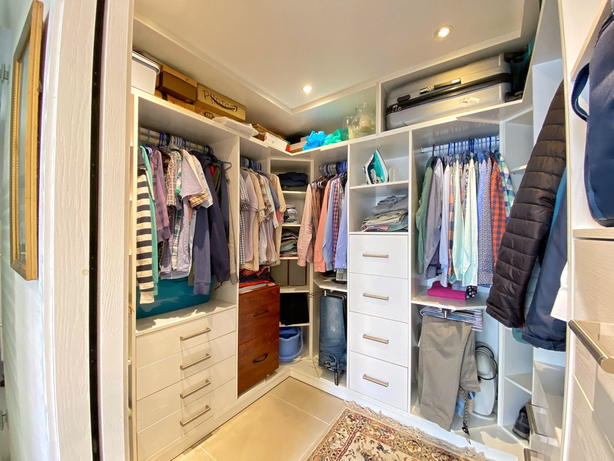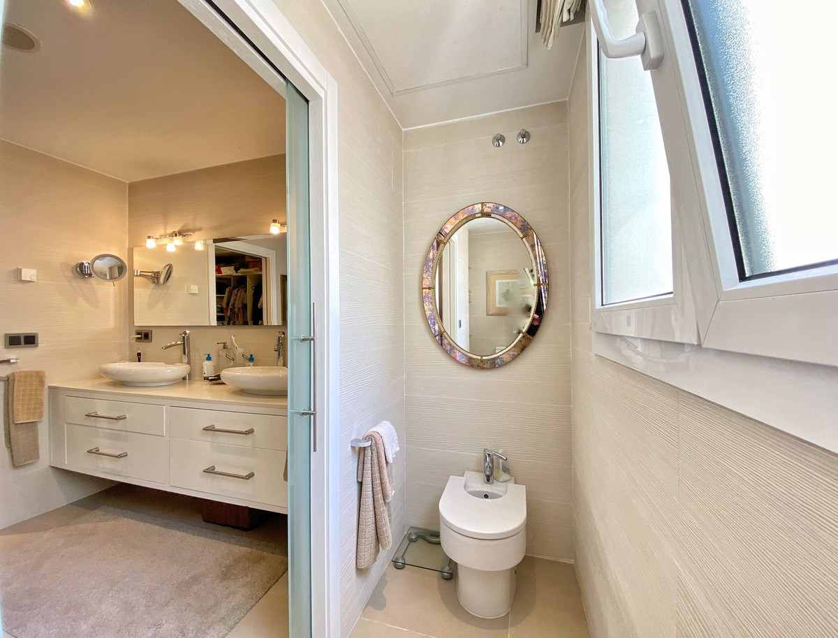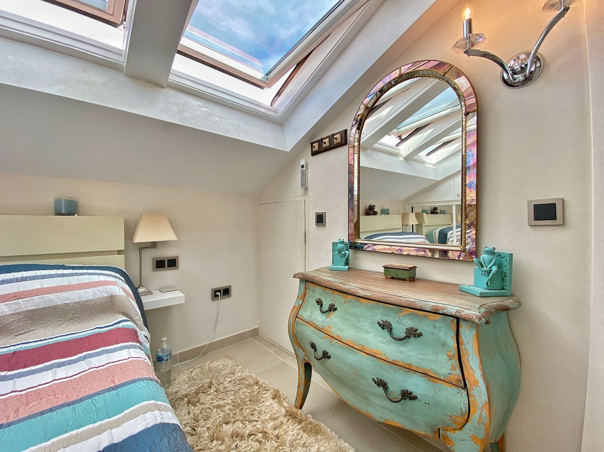The property has two bedrooms, one on each floor, two full bathrooms with underfloor heating, a spacious living-dining room, and a fully equipped kitchen. The master bedroom is very spacious and has its own large dressing room.