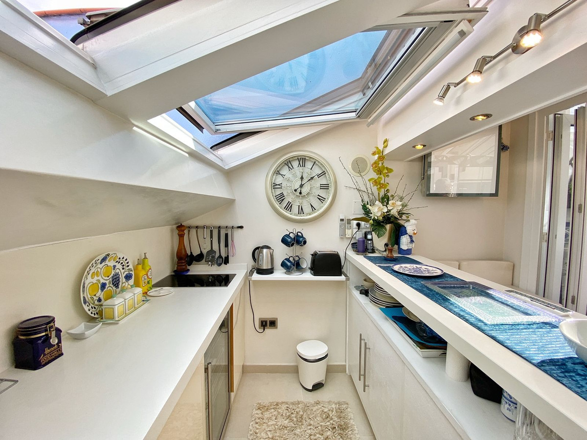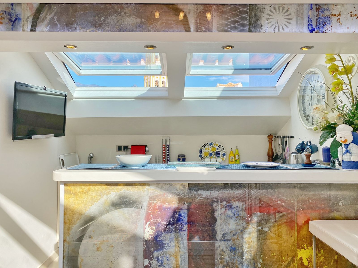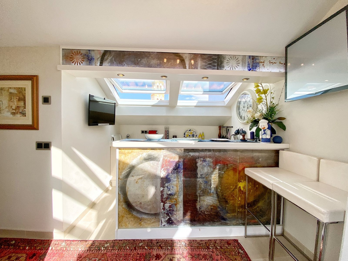 On the upper floor, there is also a second small kitchen, located next to a sunny, 35 m2 covered outdoor terrace with a Jacuzzi and views of the Old Town.