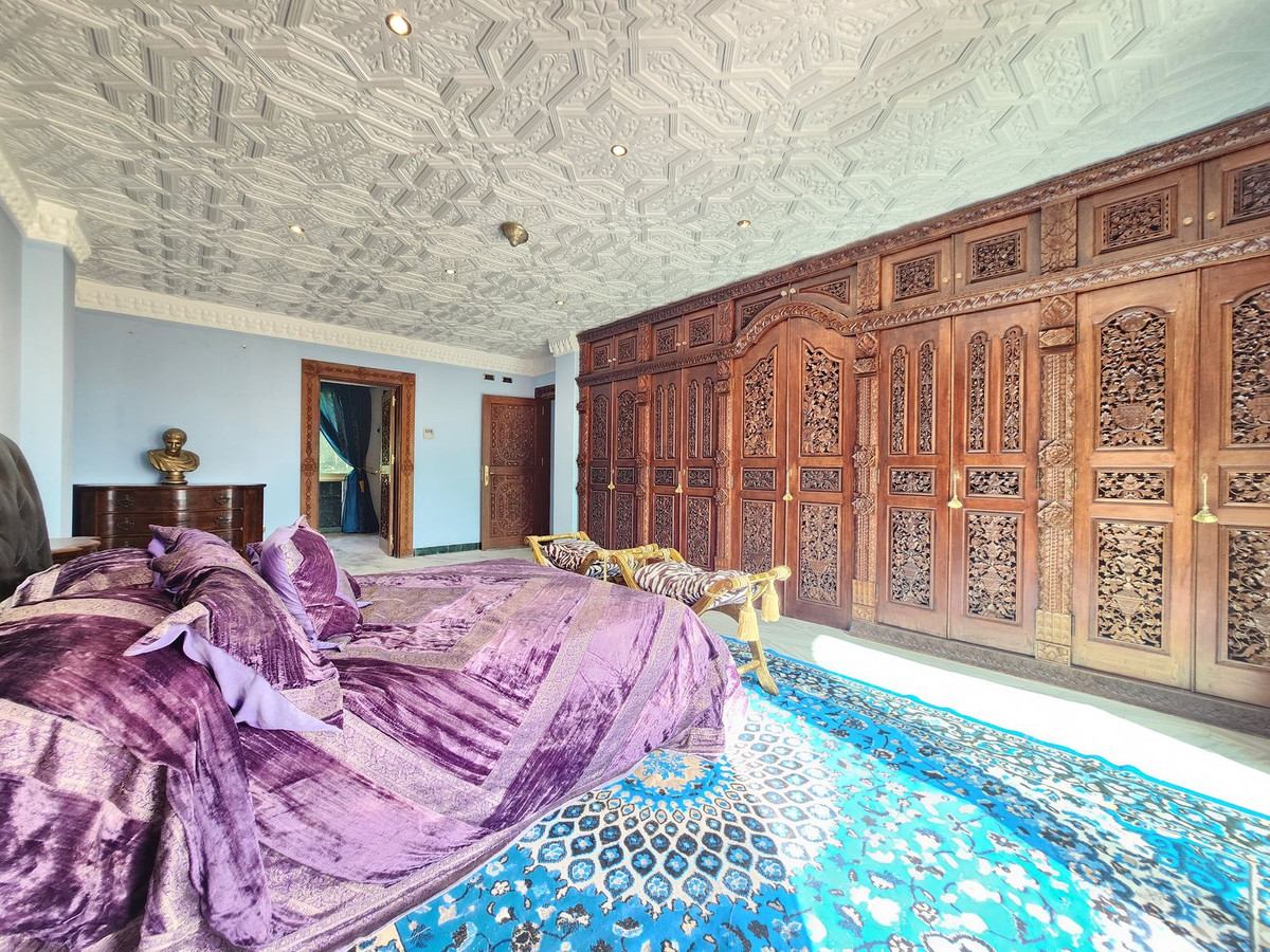 To the left, a sliding double door opens to a large, bright double living room with sea views and windows overlooking the side garden. The high ceiling is lined with hand-carved mahogany wood, adding an artisanal touch to the space. This floor also includes a bright bedroom with garden views and a marble bathroom, perfectly equipped.