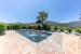 The exterior features a mature garden of 4,395 m² with a private pool, a charming front patio, rear terrace with direct pool access, a garage, and parking space for several vehicles.