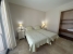 The master bedroom includes a large en-suite bathroom and a dressing room, with direct access to the garden through expansive windows. The other two bedrooms are situated at the back of the apartment and share a bathroom.